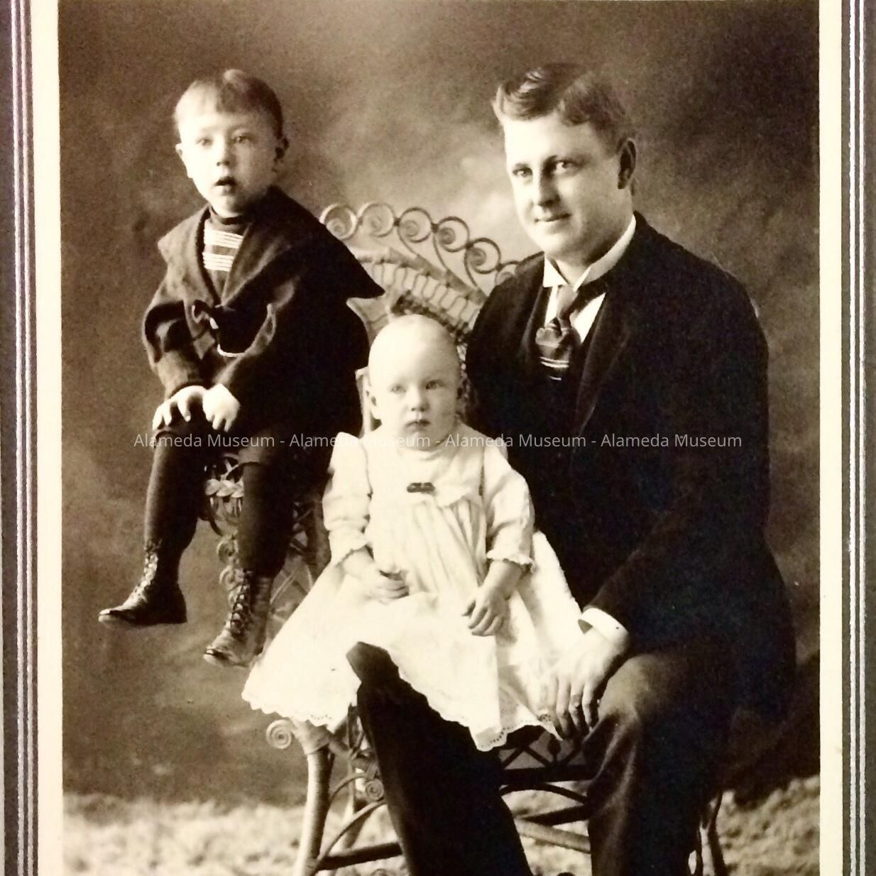 Description: A black/white cabinet format photograph portraying an unidentified suit-clad man posed with two small children.