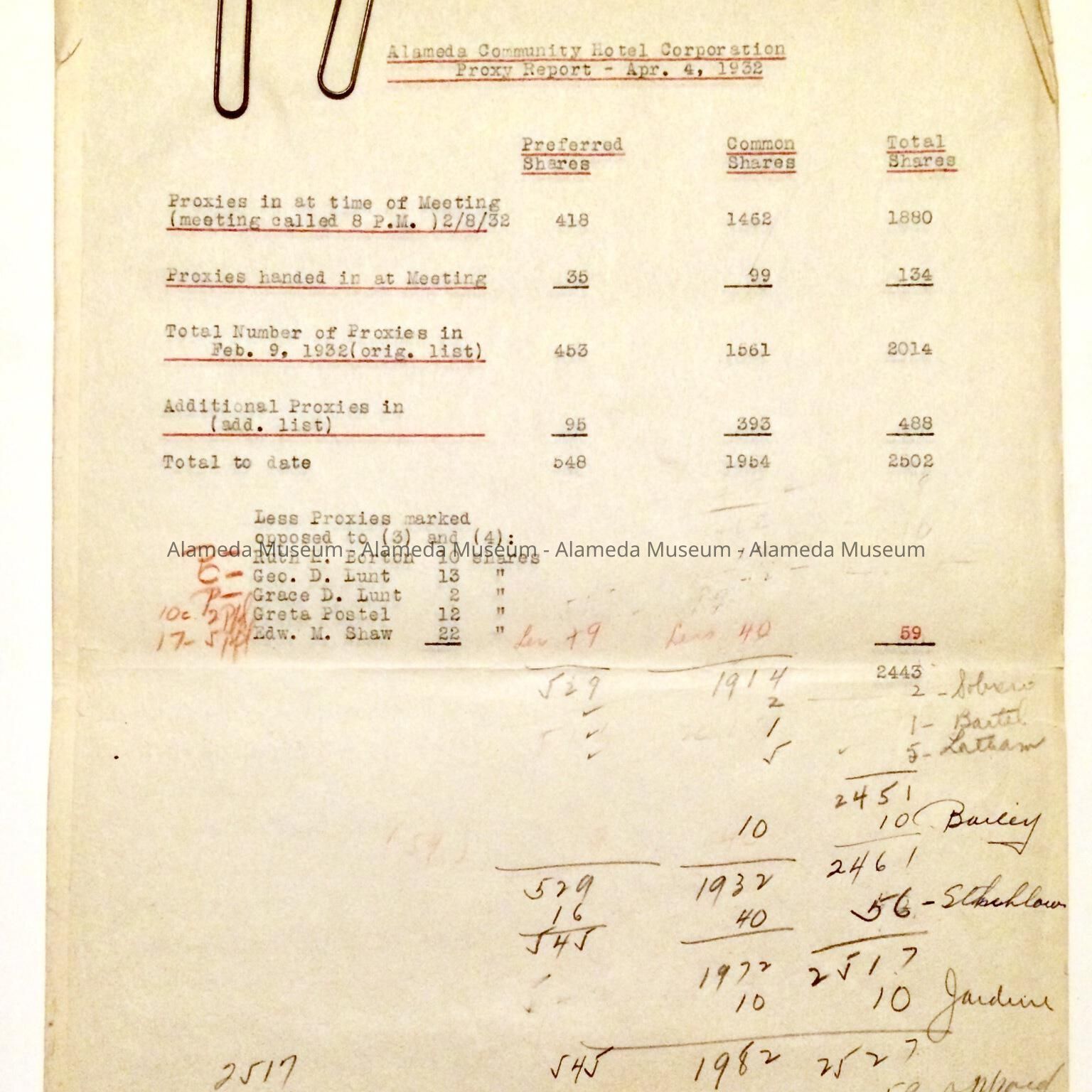 Carbon copy of 'Alameda Community Hotel Corporation' proxy report, 1932Entry/Object ID