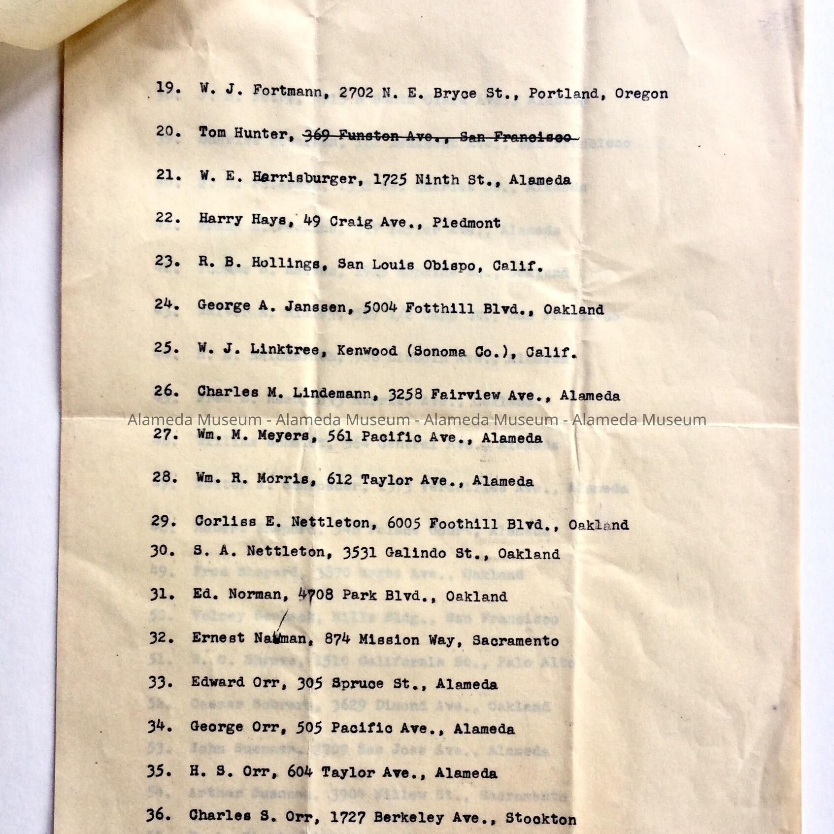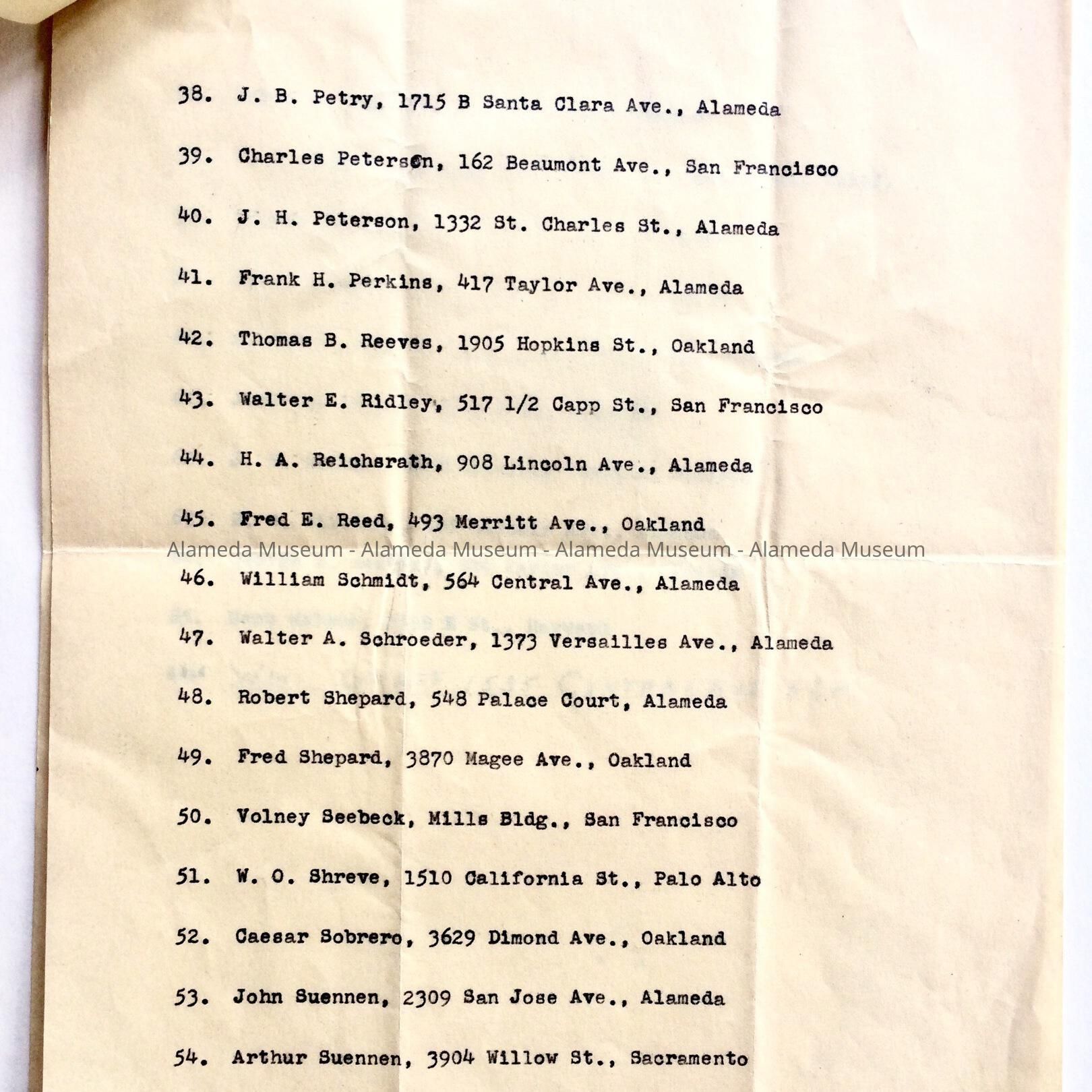 ROSTER OF THE WEST END SCHOOL BOYS ASSOCIATION. ALAMEDA. LISTING NAMES AND ADDRESSES OF MEN WHO ATTENDED THE WEST END SCHOOL PRIOR TO 1895, AFTER WHICH TIME THE SCHOOL WAS NAMED "LONGFELLOW."