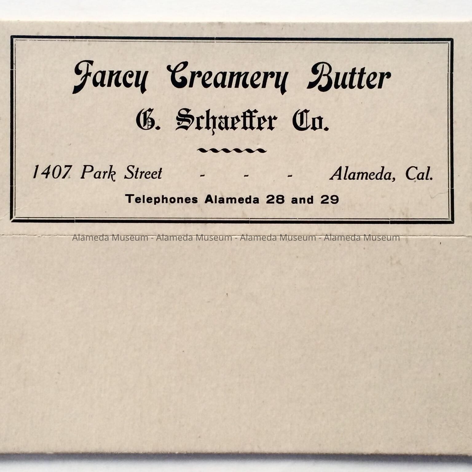 Cardboard container for butter from the George Schaeffer Company, 1407 Park Street, a business that operated here for many years.