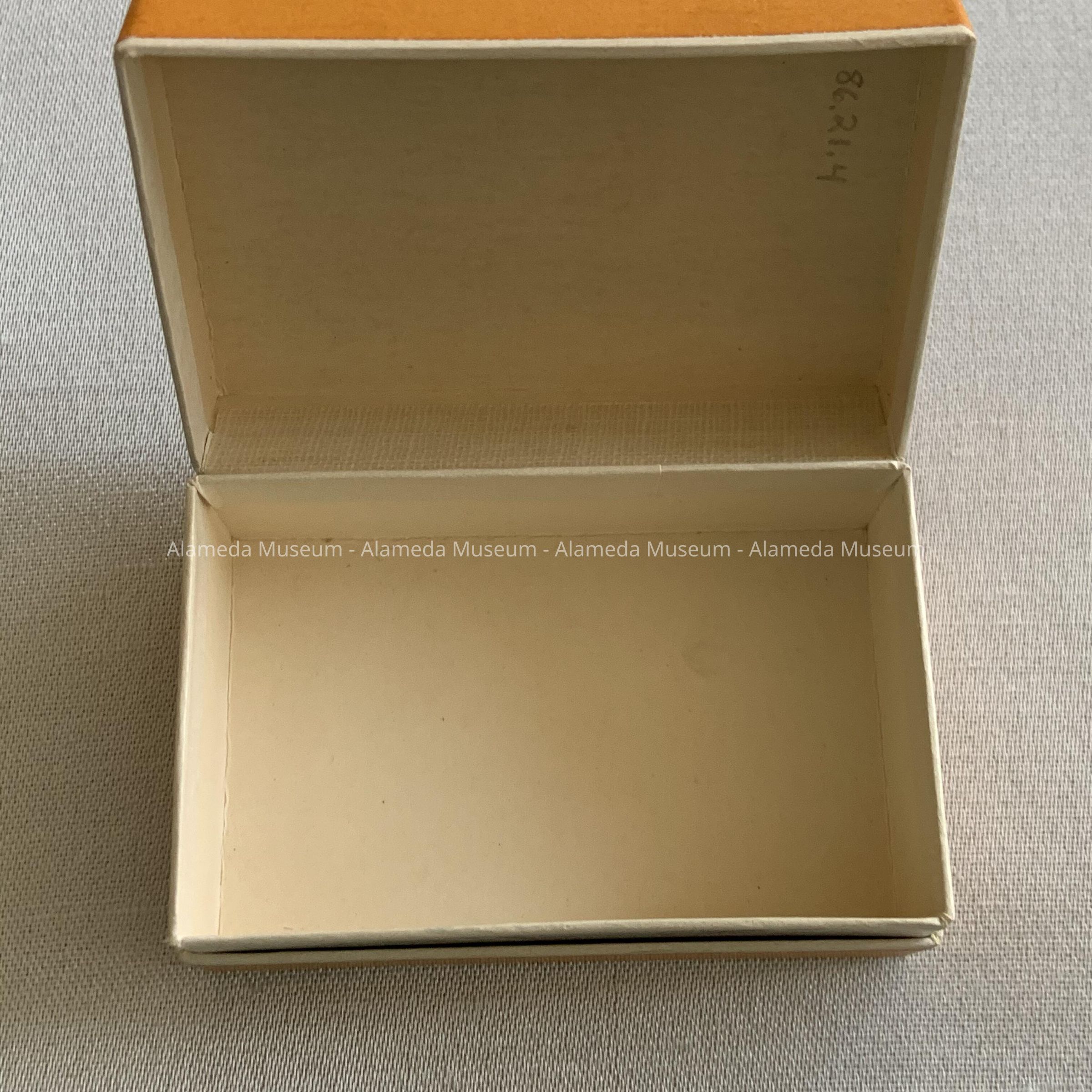 Description: Cardboard box covered in orange colored paper, lid with printed caption " The Owl Drug Co."