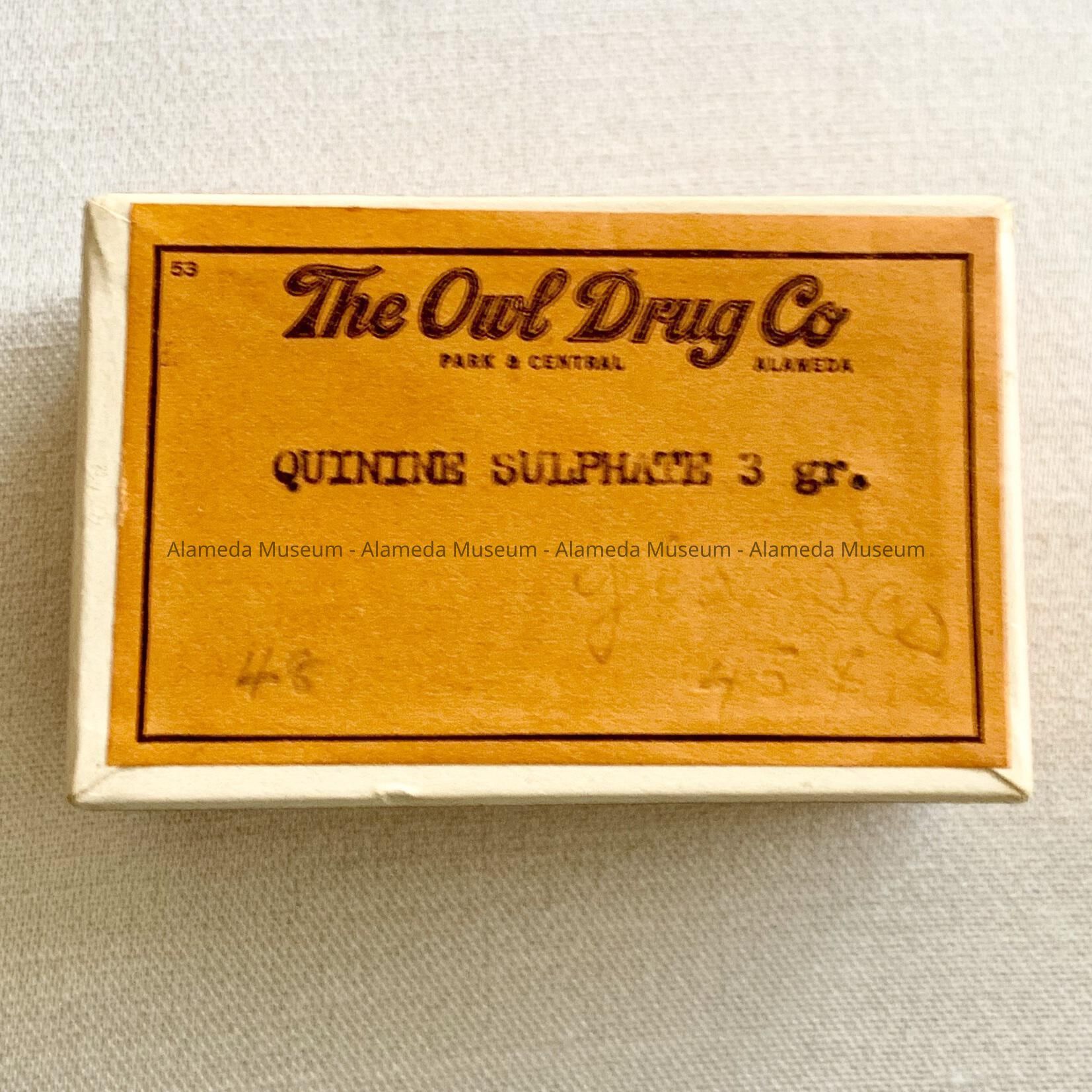 History of Object: Pill box which originally contained quinine sulphate, purchased at the Owl Drug Company store, Park & Central, Alameda.