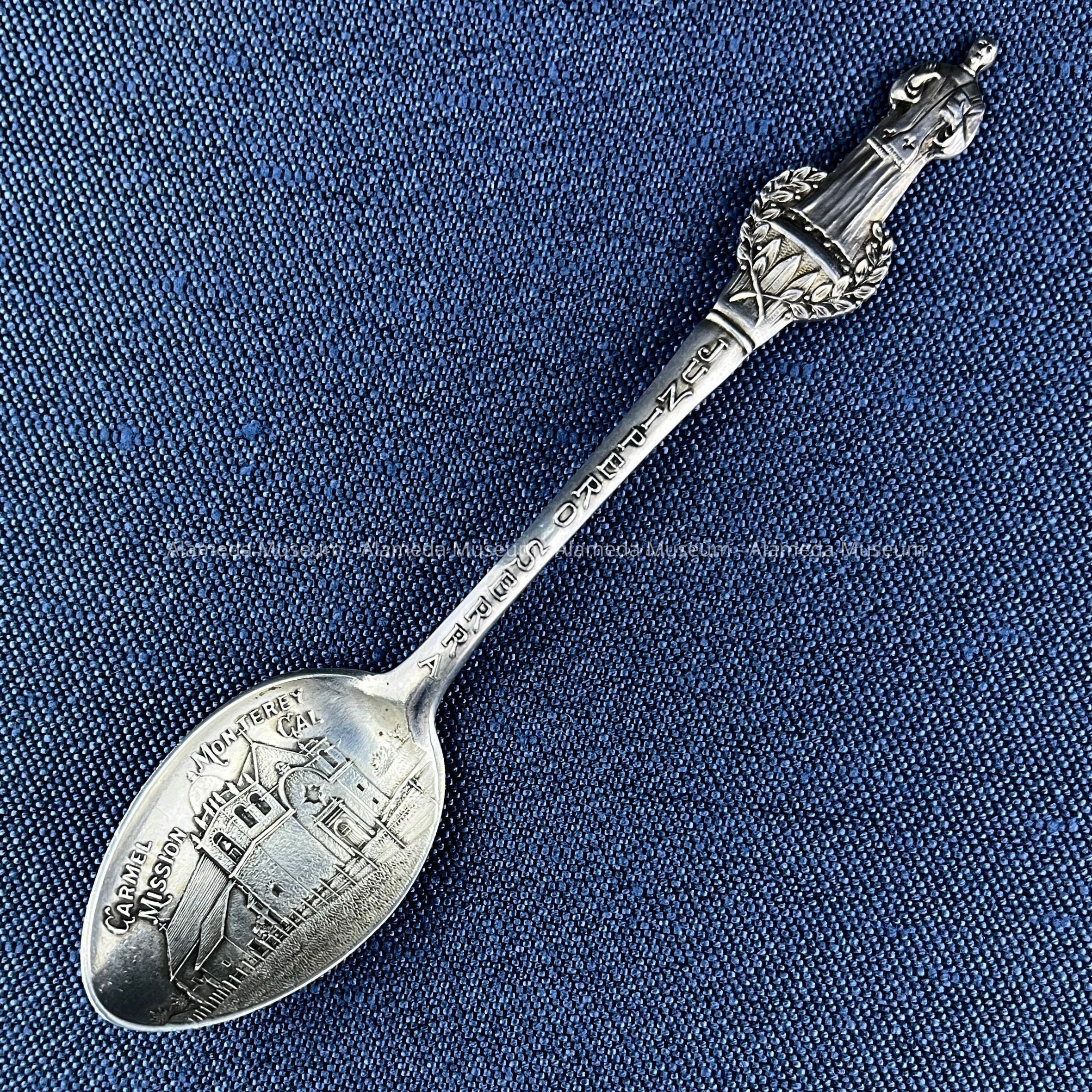 Description: Sterling silver demitasse spoon with figural handle (representing Father Serra). Bowl containing scene (in relief) of Carmel Mission, Monterey, Cal.
