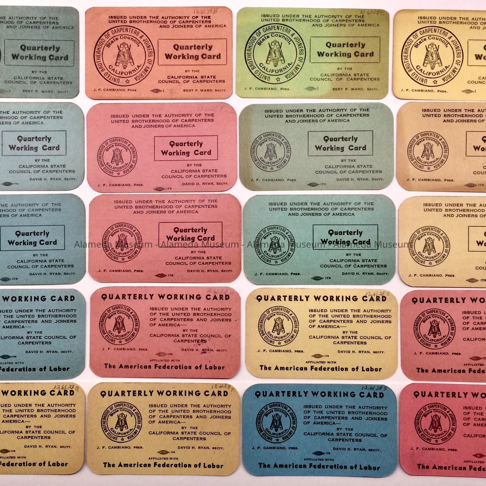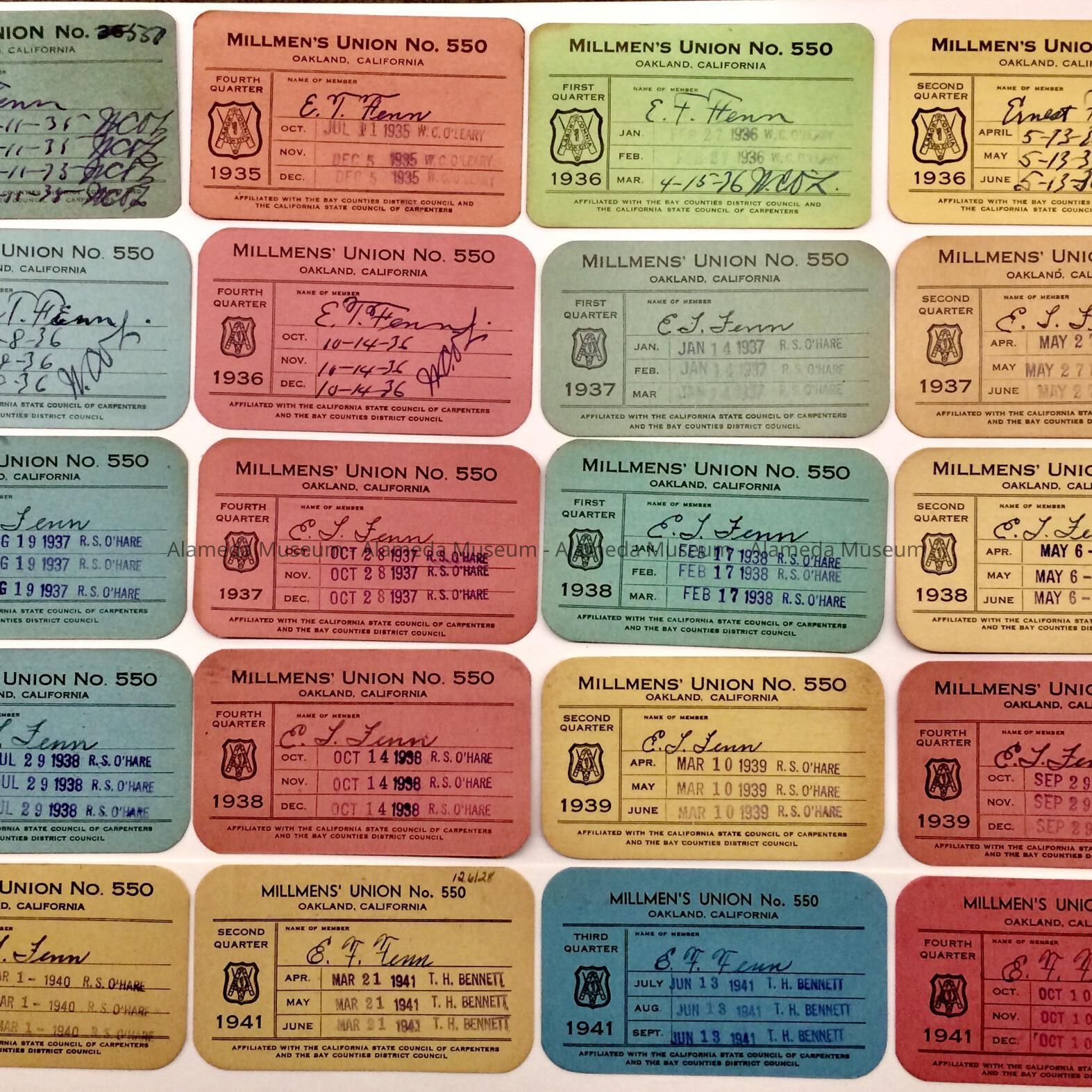 HISTORY OF OBJECTS: QUARTERLY MEMBERSHIP PAYMENT CARDS FOR ERNEST FENN, MEMBER OF LOCAL UNION #550 OF THE CARPENTERS AND JOINERS UNION, OAKLAND. ERNEST AND HIS WIFE PURCHASED A HOME AT 2038 ALAMEDA AVENUE, AND OCCUPIED IT UNTIL THEIR DEATHS.