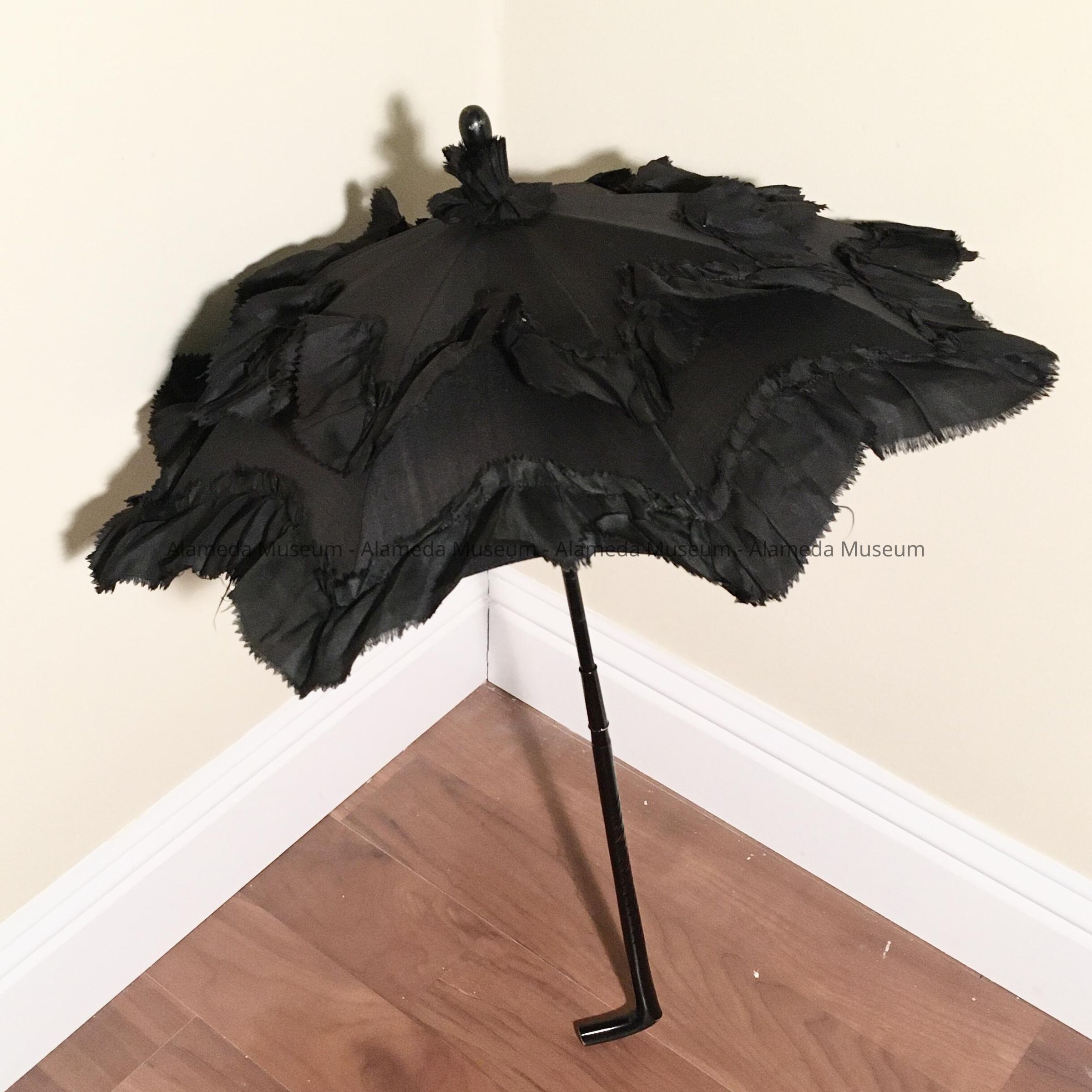 DESCRIPTION: Folding handle in ebonized wood with a reeded design; has a brass hinge that allows the handle to collapse; covered in black silk.