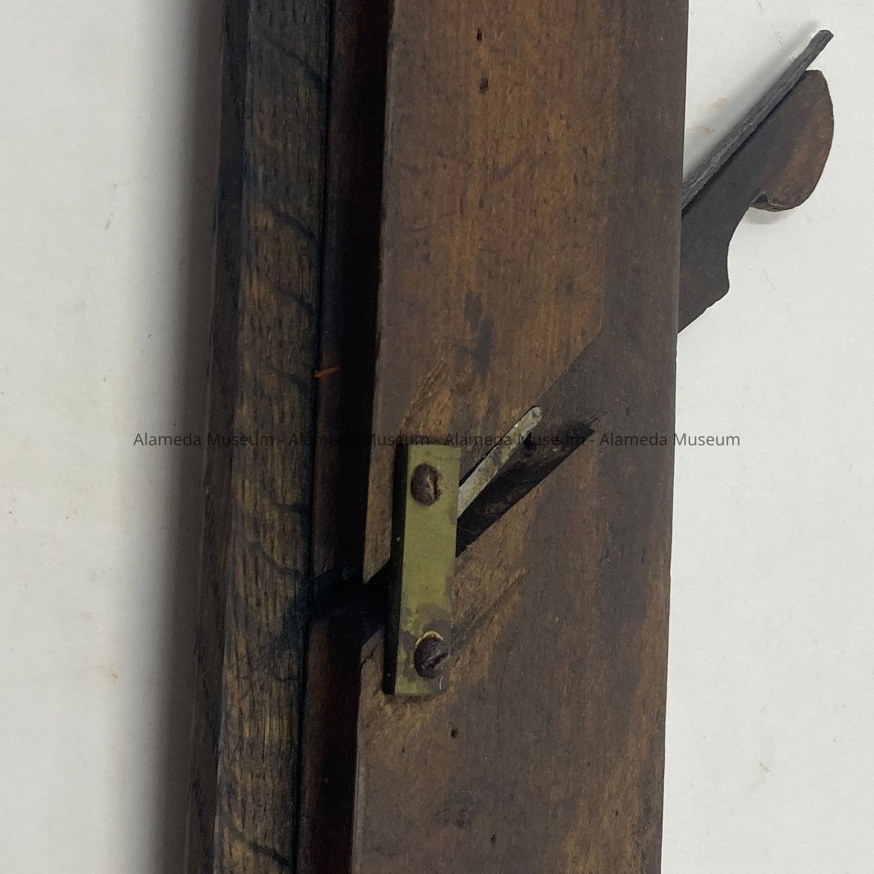 Description: Rectangular wooden tool with metal blade inside, with a metal piece attached with screws.