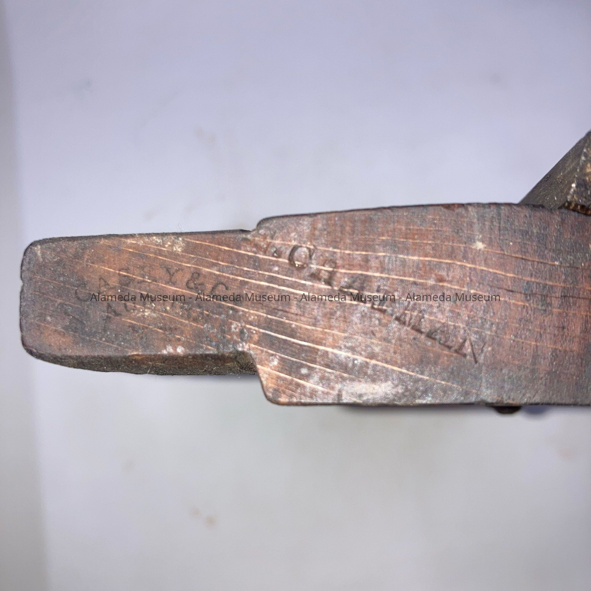 History of Object: Casey & Co. 9.5” Hand plane No. 1, part of a collection of carpentry tools, owned by John Ucovich (presumed), an immigrant carpenter from Montenegro. John Ucovich moved to Alameda around 1925, and ran a trucking business in Oakland. By 1938 John (aged 61) lived with his wife, Myrtle May, at 775 Santa Clara. He died as the result of injuries sustained after being run over by a streetcar on March 28, 1938.