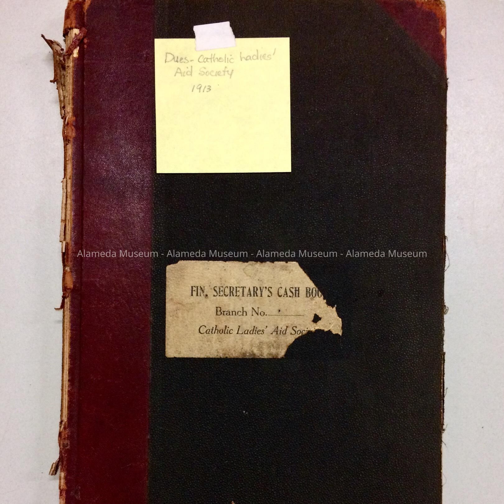DESCRIPTION : HARD-BOUND BOOK WITH A COVER OF BLACK-COLORED IMITATION LEATHER. PAPER LABEL READS, "FIN. SECRETARY'S CASH BOOK, BRANCH NO., CATHOLIC LADIES' AID SOCIETY, BRANCH #3, ALAMEDA, 1913."