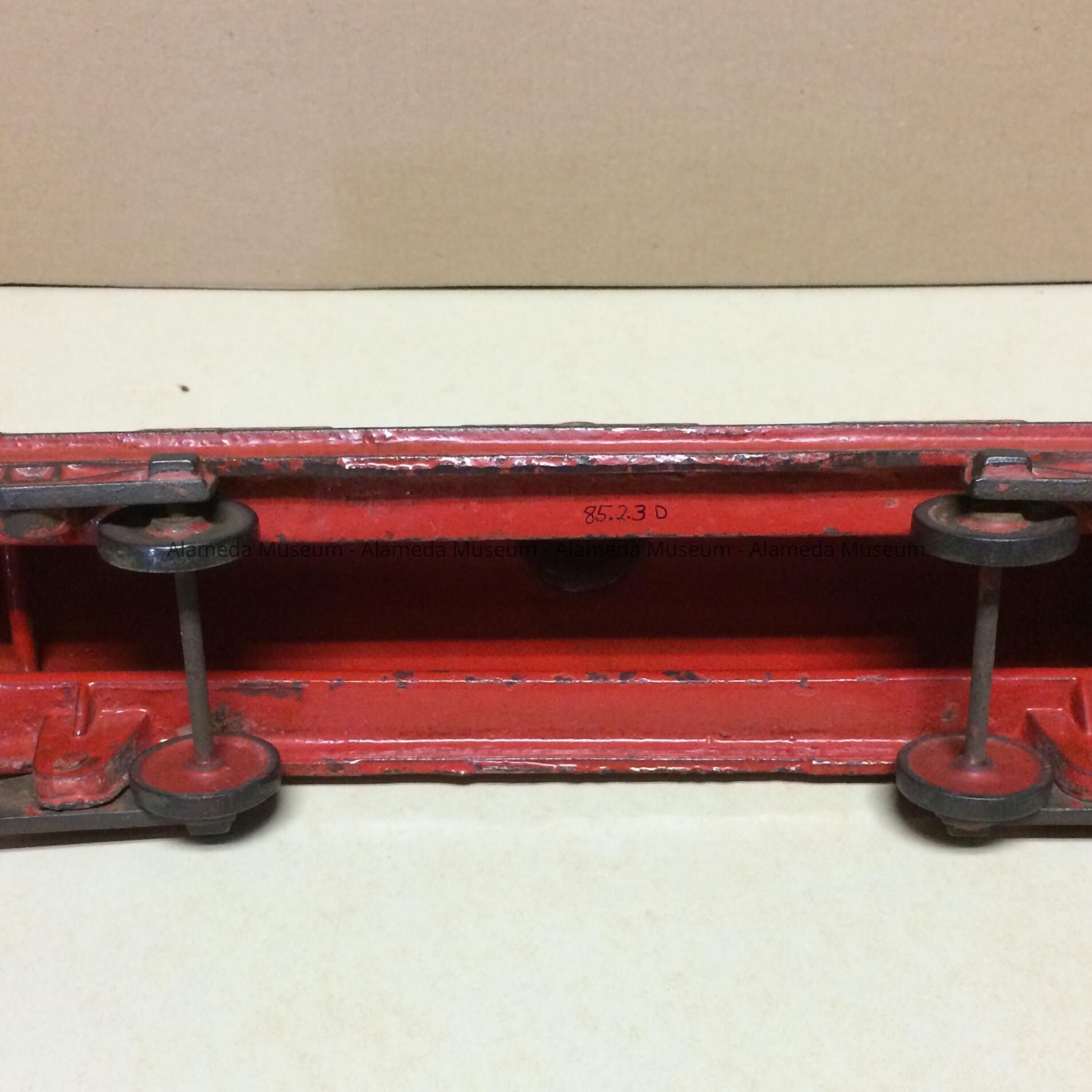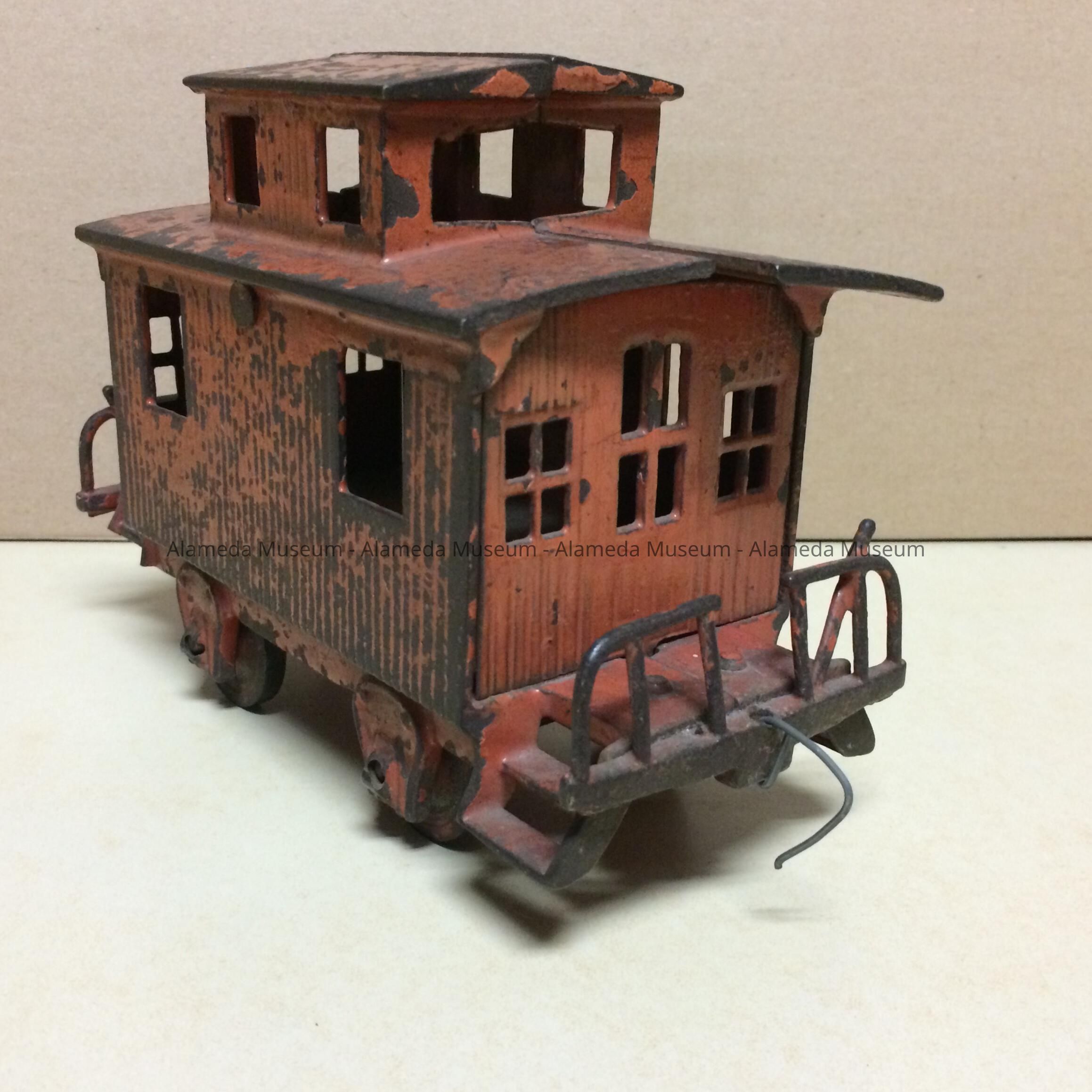 Caboose (E): On four wheels, Cast in two pieces; held together with bolts. Has the original orange-red paint.