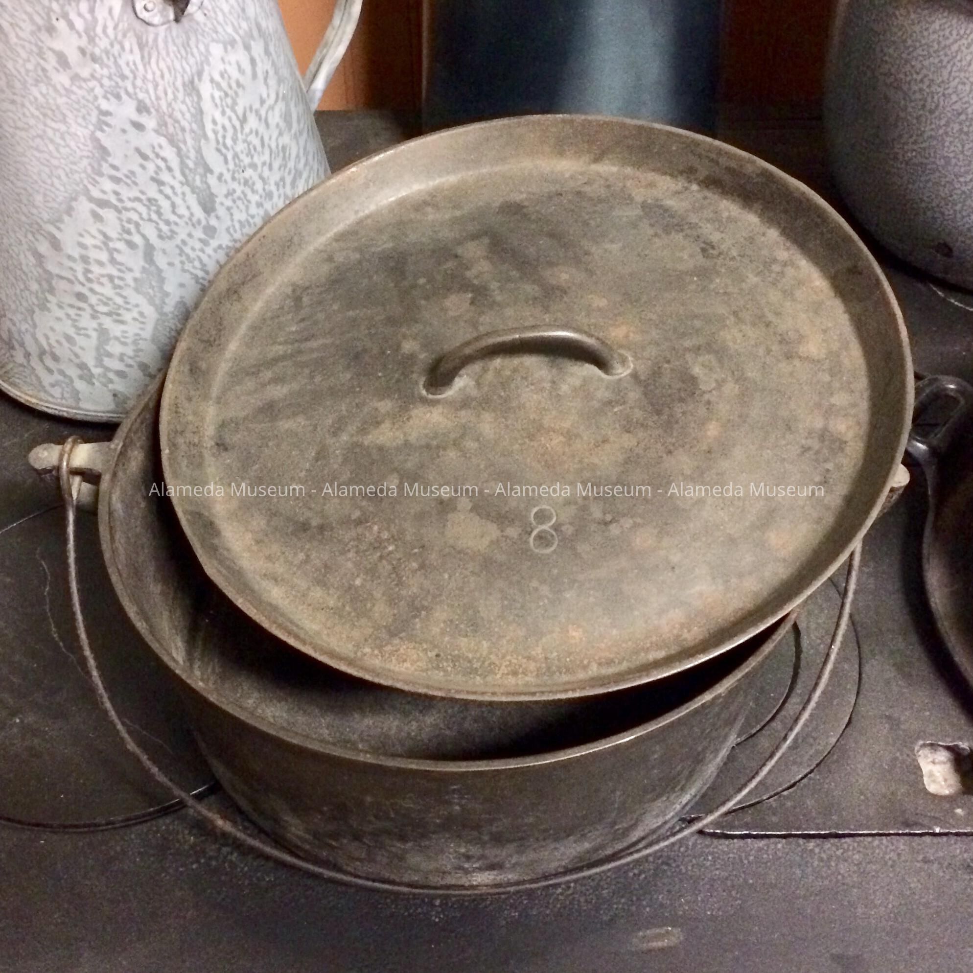 Description: Cast iron pot (bail handle) & lid (center handle grip). Incised number "8" on lid.
