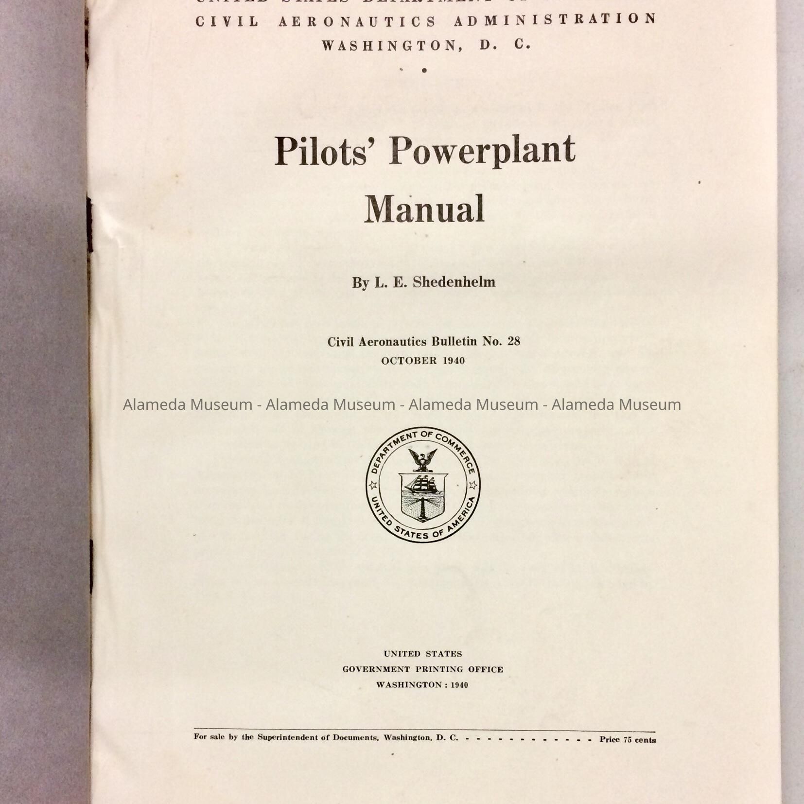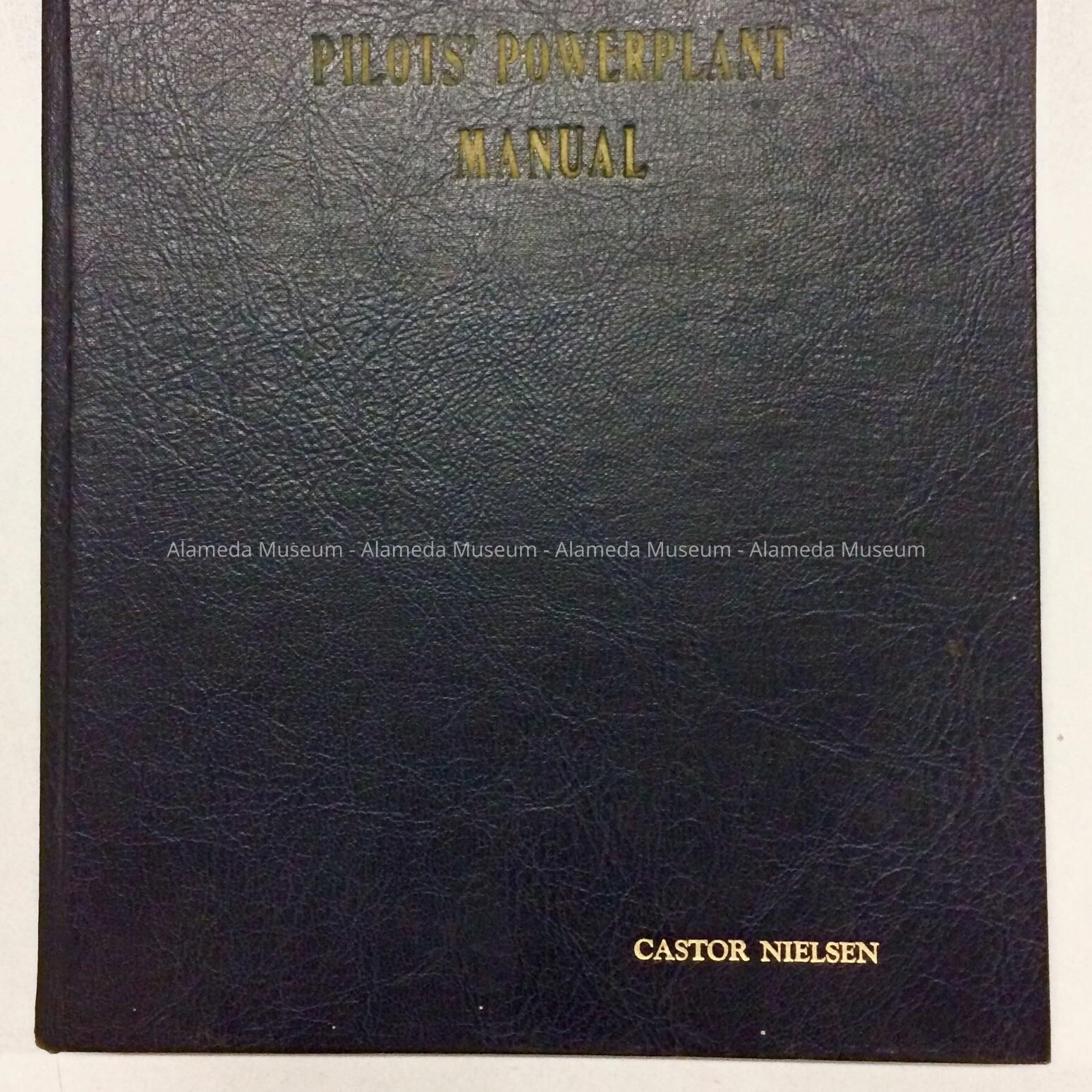 Description: Hardbound manual with cover design of imitation leather, dark blue-colored, with incised caption in gold "Pilots Powerplant Manual." Contents: illustrations, text, and diagrams.