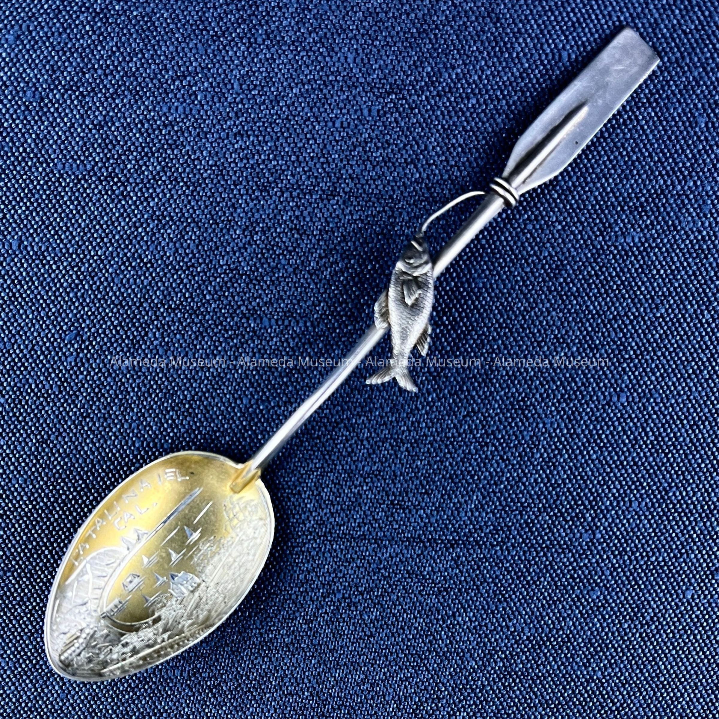 Description: Sterling silver demitasse spoon with gold washed bowl containing an engraved scene of Catalina, California. A decorative handle in the form of an oar upon which is entwined a fish, is an unusual aspect of the spoon.