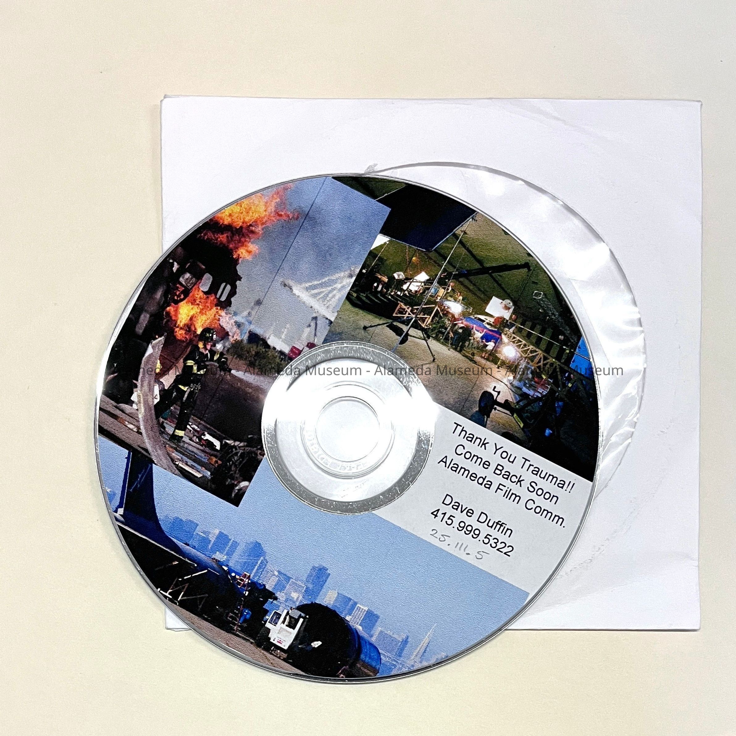 Description: printed CD-R disk, in paper and plastic sleeve, labeled 'Thank you Trauma!! / Come Back Soon / Alameda Film Comm. / Dave Duffin / 415 999.5322'.