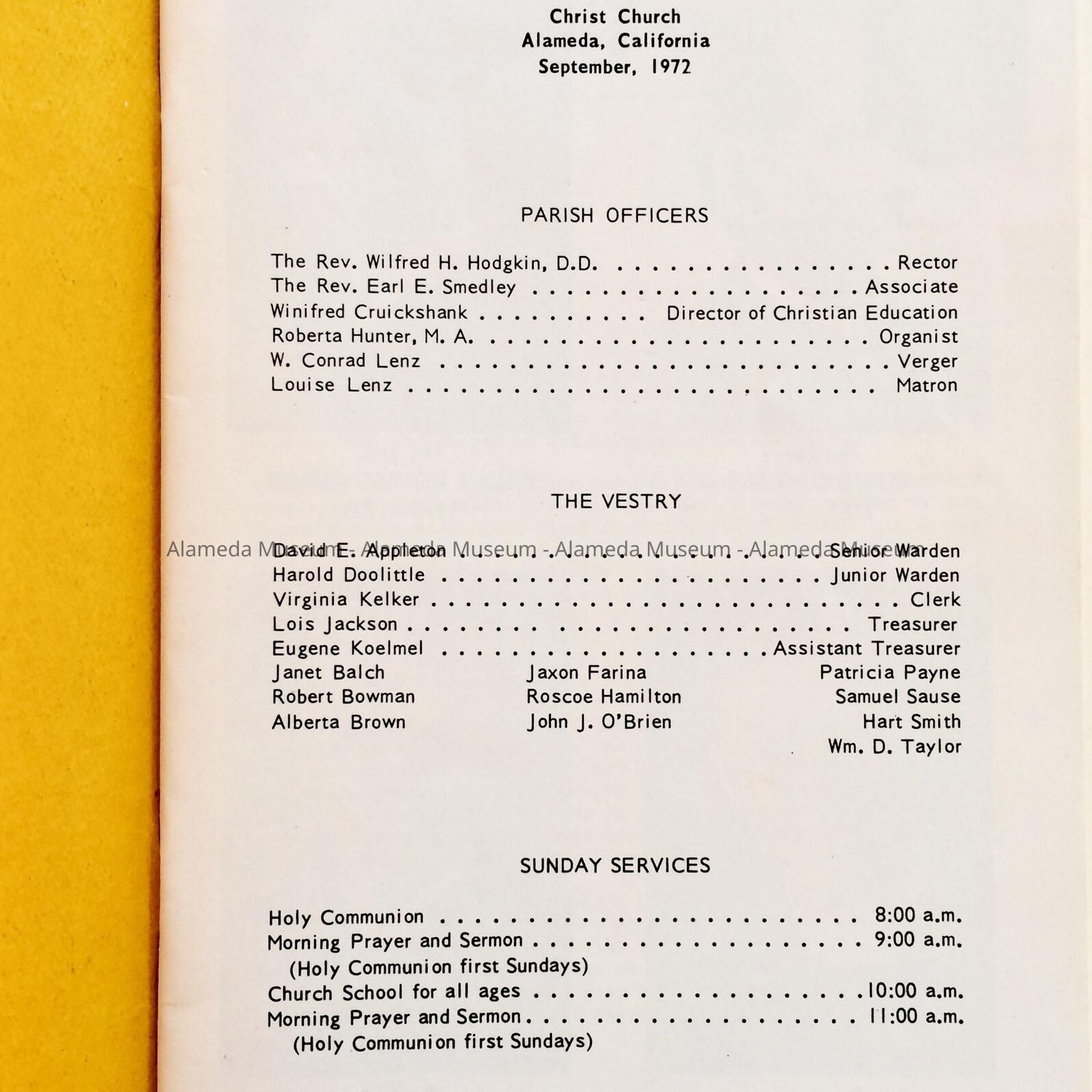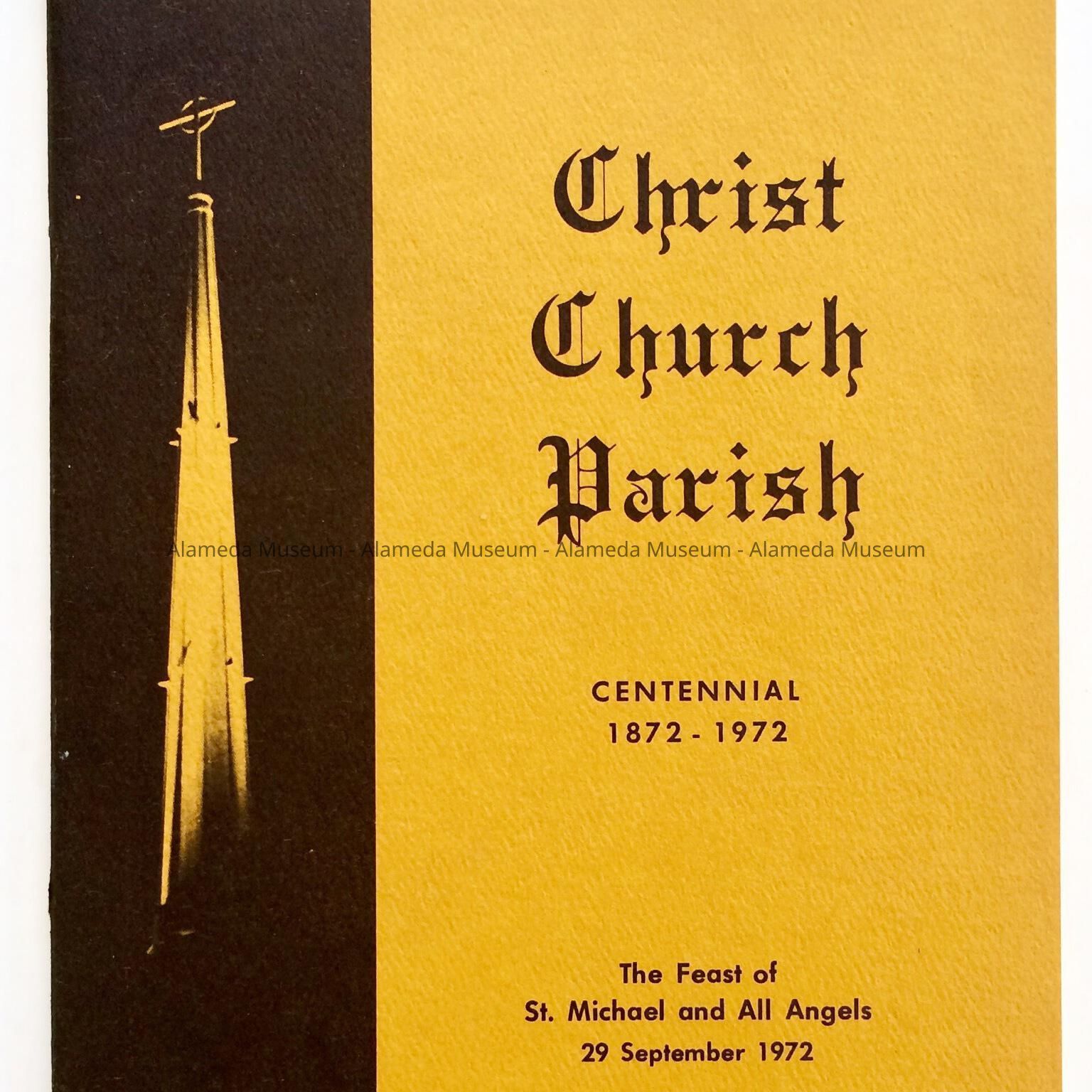 SOFT-BOUND BOOKLET, WITH COVER DESIGN FEATURING PHOTO OF CHURCH SPIRE. BOLD-PRINTED CAPTION, "CHRIST CHURCH PARISH," APPEARS IN BLACK-COLORED TYPE ON A GOLD-COLORED BACKGROUND.