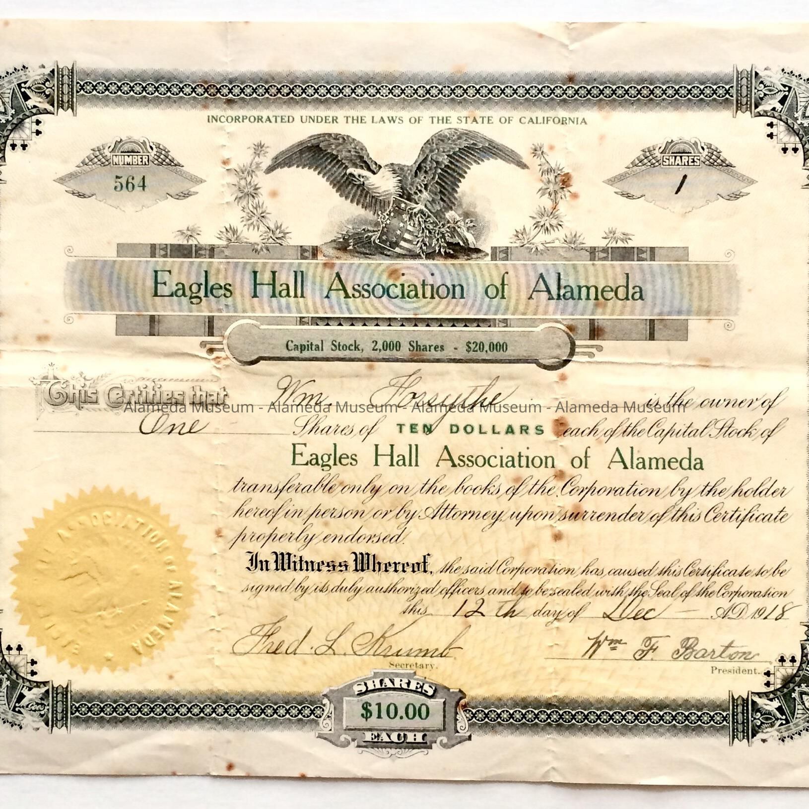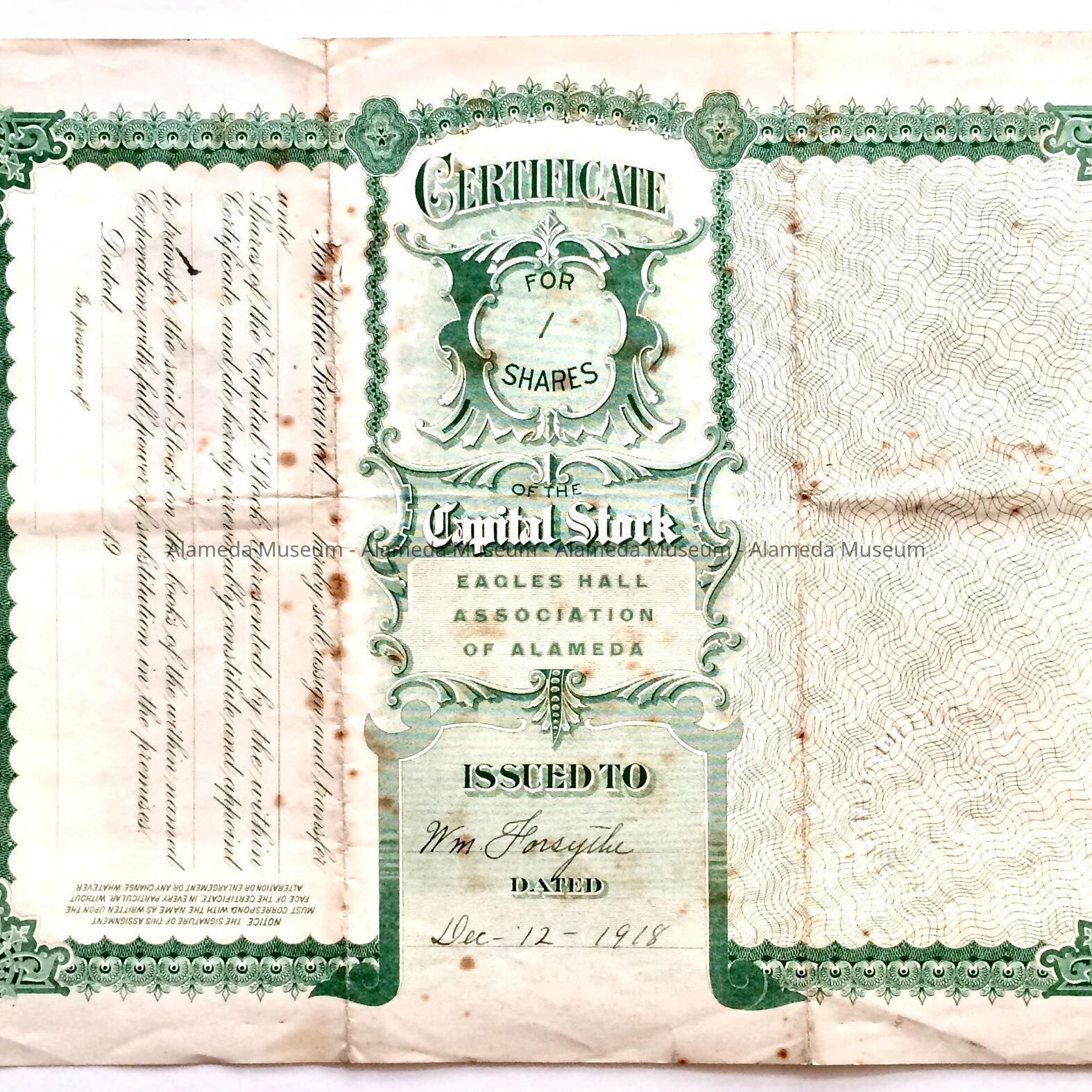 History of Object: Certificate for 1 share of Capital Stock "Eagles Hall Association of Alameda," issued to Wm. Forsyth, and dated Doc. 12, 1918.