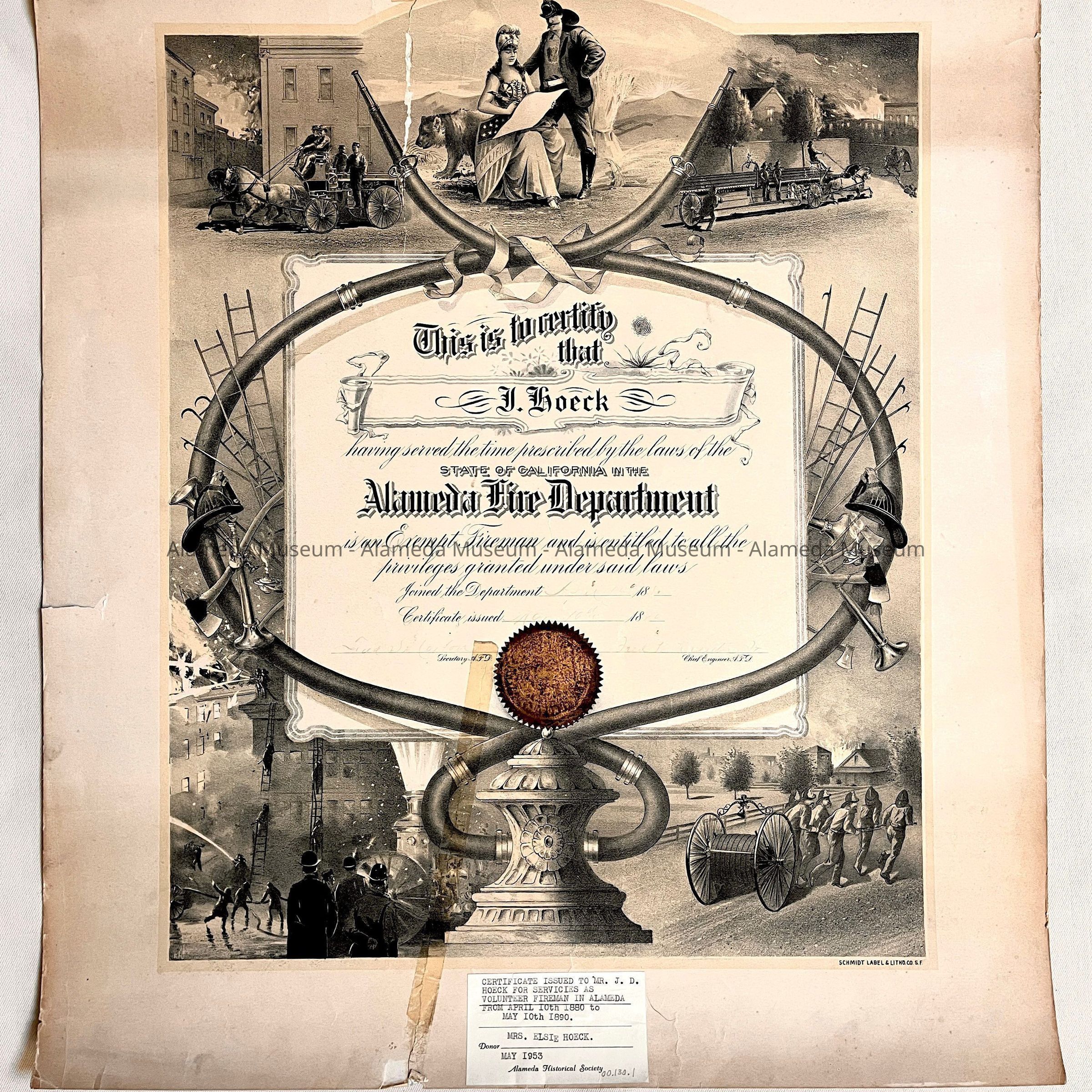 History: Certificate awarded to J. Hoeck served as a volunteer fireman from April 10, 1880 through May 10, 1890. The document was given to the Alameda Historical Society in May 1953 and never catalogued.