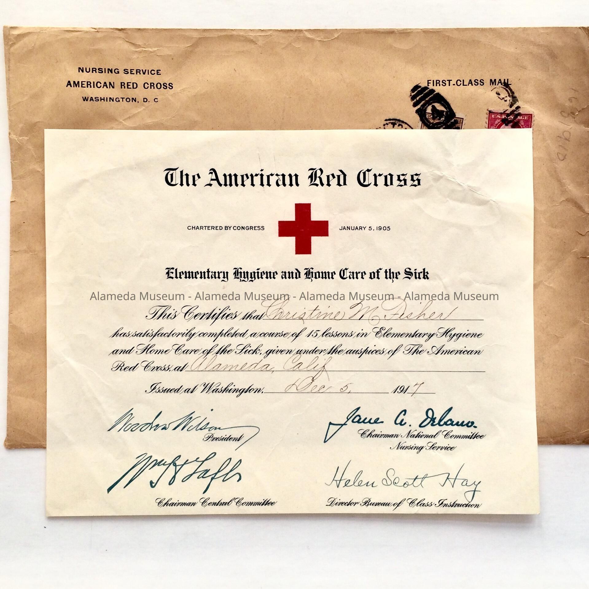 Certificate & envelope issued by the American Red Cross (Washington, D. C.) to Miss. Christine M. Fisher, for completing a course in Elementary Hygiene & Home Care of the Sick. The course was given by the Alameda Branch of the Red Cross.