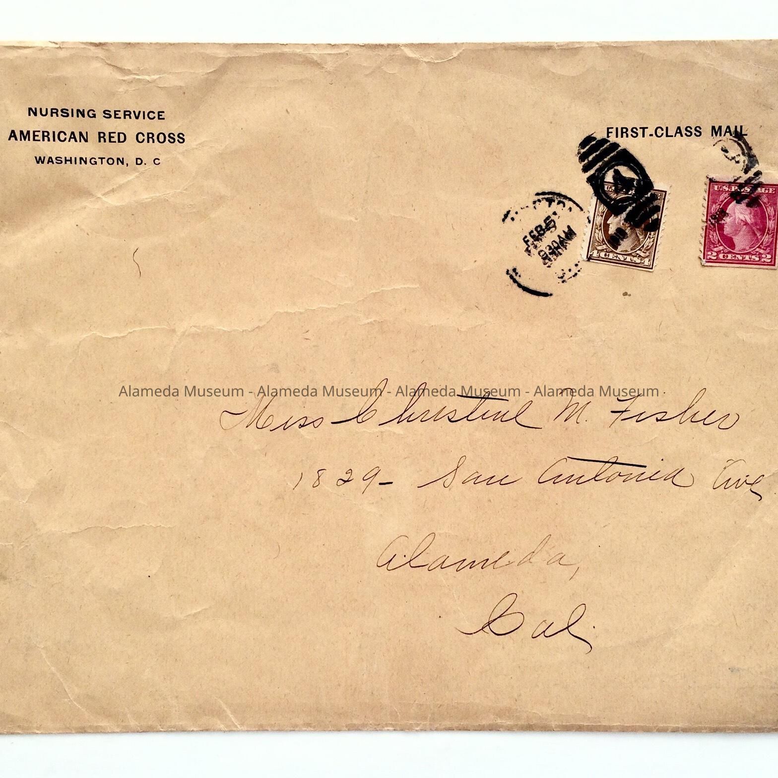 Description: Printed certificate with bold type heading "The American Red Cross", & original envelope (addressed to Miss. Christine M. Fisher, 1829 San Antonio Ave., Alameda, Cal.).