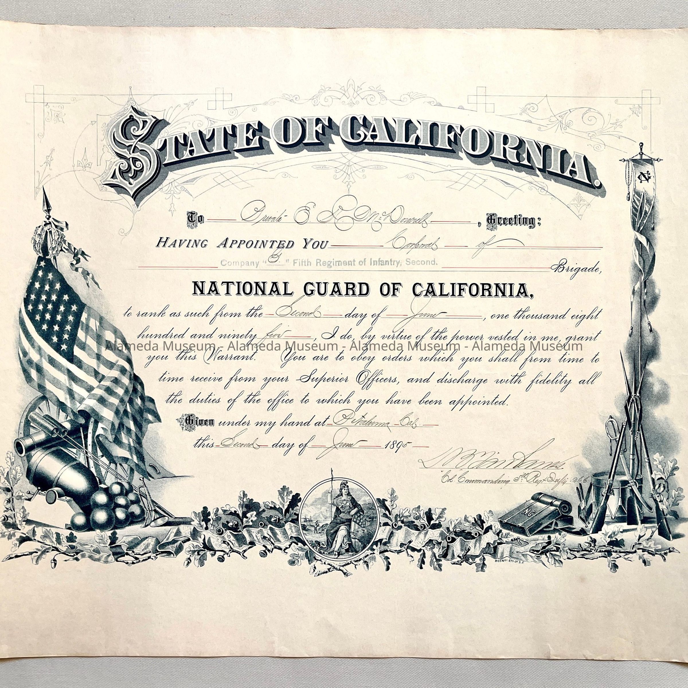 History of Object: Certificate appointing Edward Robert McDonell, as Corporal of Company G., Fifth Regiment of Infantry, Second Brigade, National Guard of California. Mr. McDonell later became an officer of Co. G., of the Alameda National Guard.