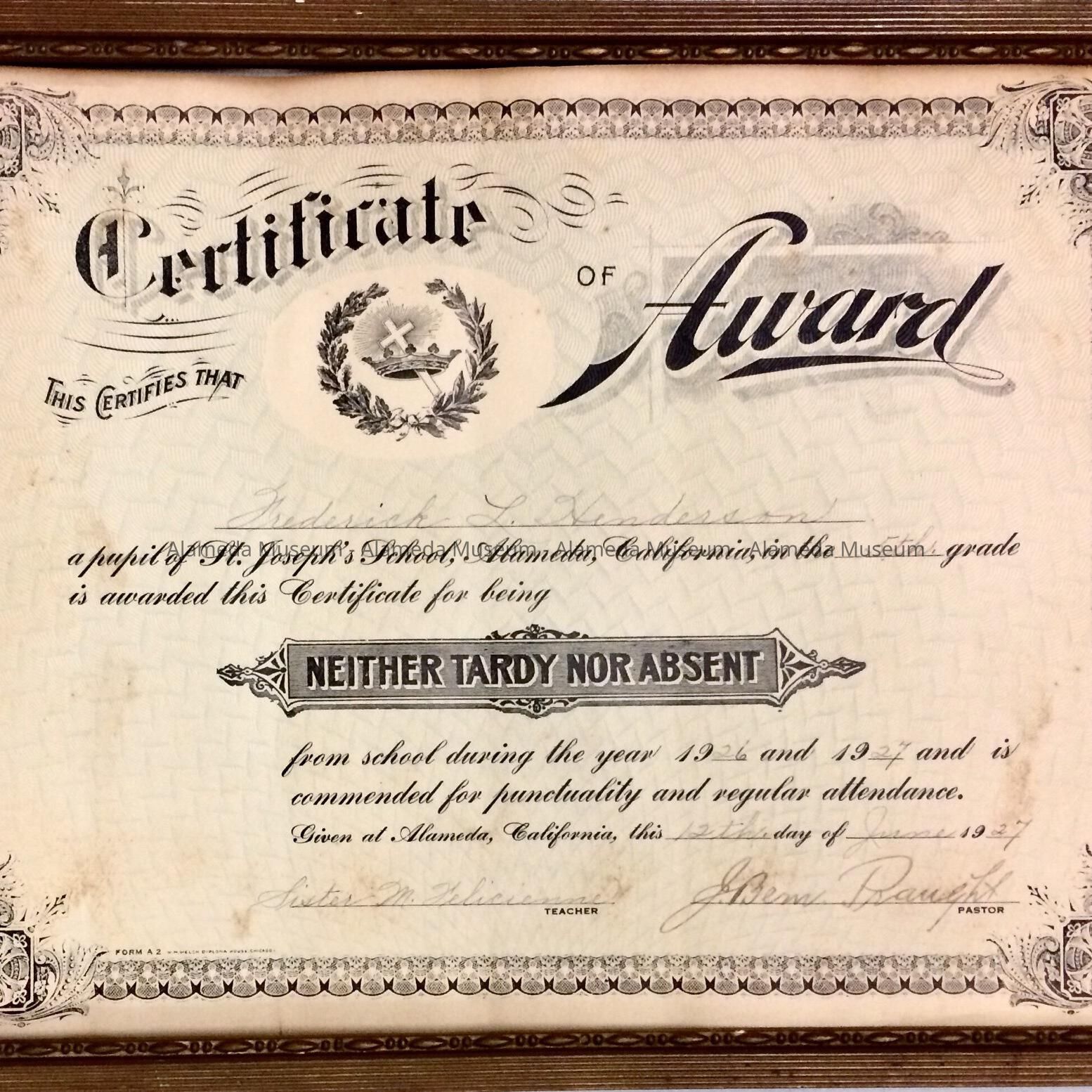 HISTORY OF OBJECT: CERTIFICATE AWARDED FREDERICK L. HENDERSON, BROTHER OF THE DONOR, FOR BEING NEITHER TARDY NOR ABSENT FROM HIS FIFTH-GRADE CLASS AT SAINT JOSEPH'S SCHOOL IN ALAMEDA, CALIFORNIA.