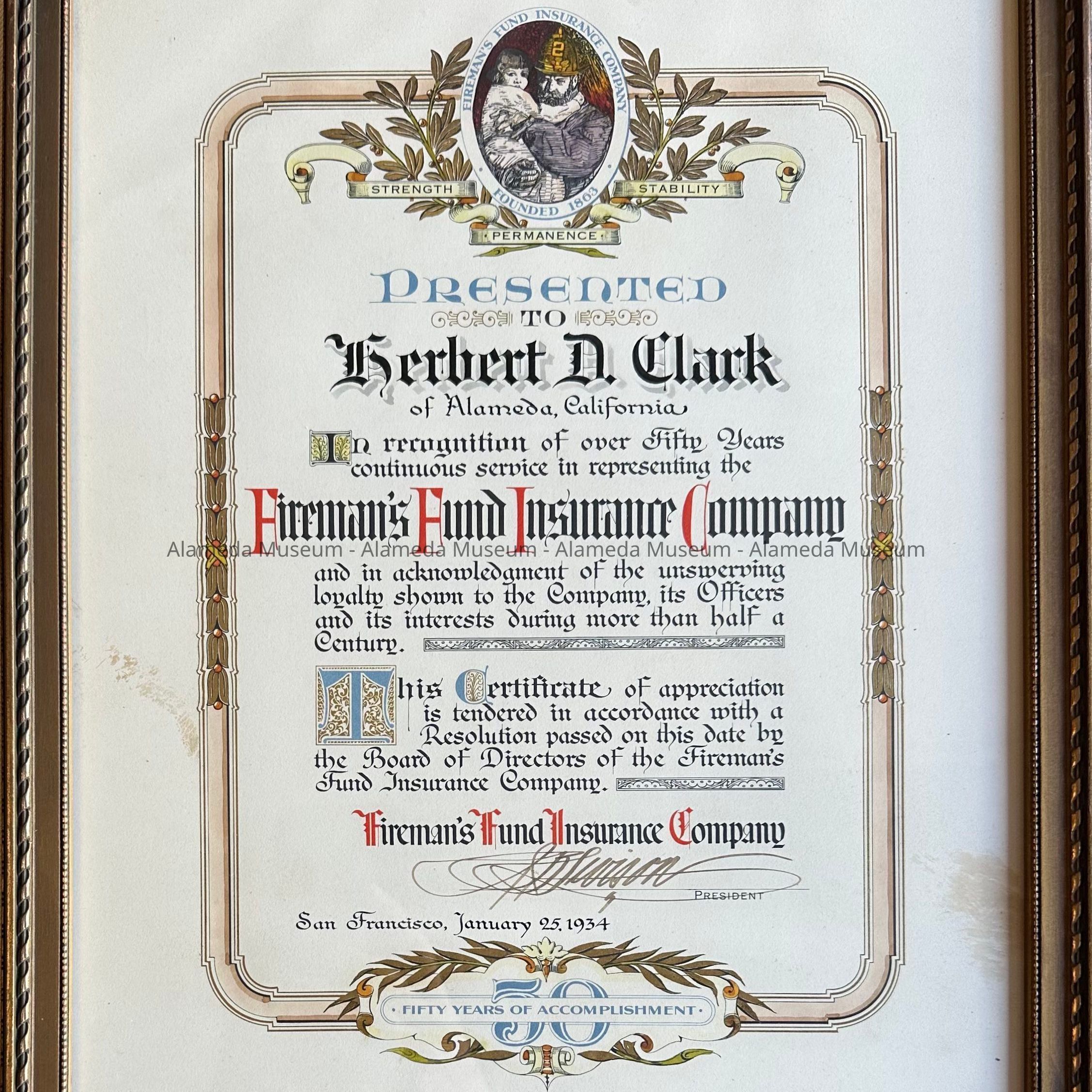 History of Object: Certificate awarded Herbert D. Clark, of Alameda, Calif, Jan 25, 1934, in recognition of over fifty years of continuous service in representing the Fireman's Fund Insurance Company. Mr. Clark and father were pioneer insurance agents in Alameda
