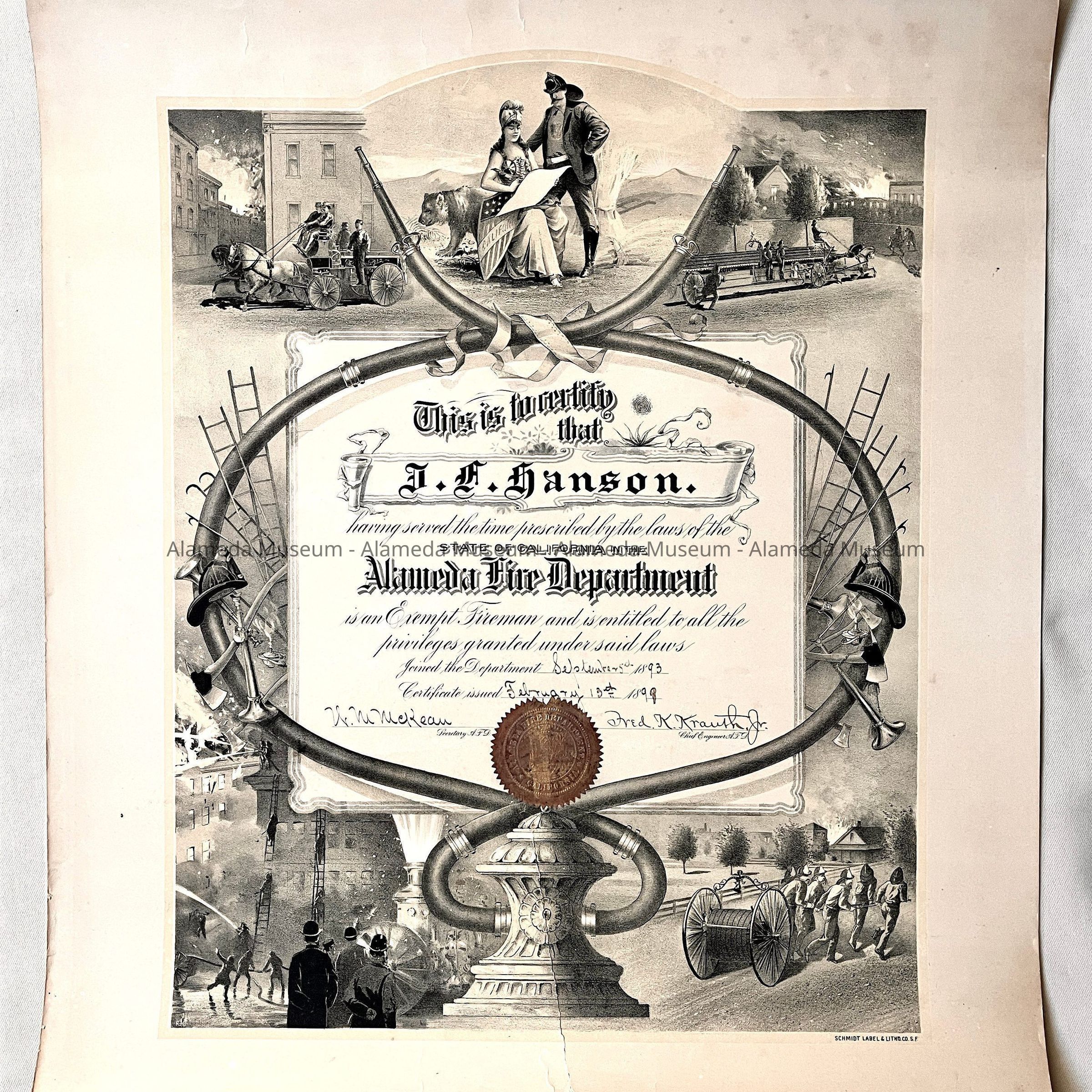 Certificate awarded John F. Hanson, for serving as an Exempt Fireman, Alameda Fire Dept, having joined Sept 5th, 1893. Certificate issued Feb 13, 1899.