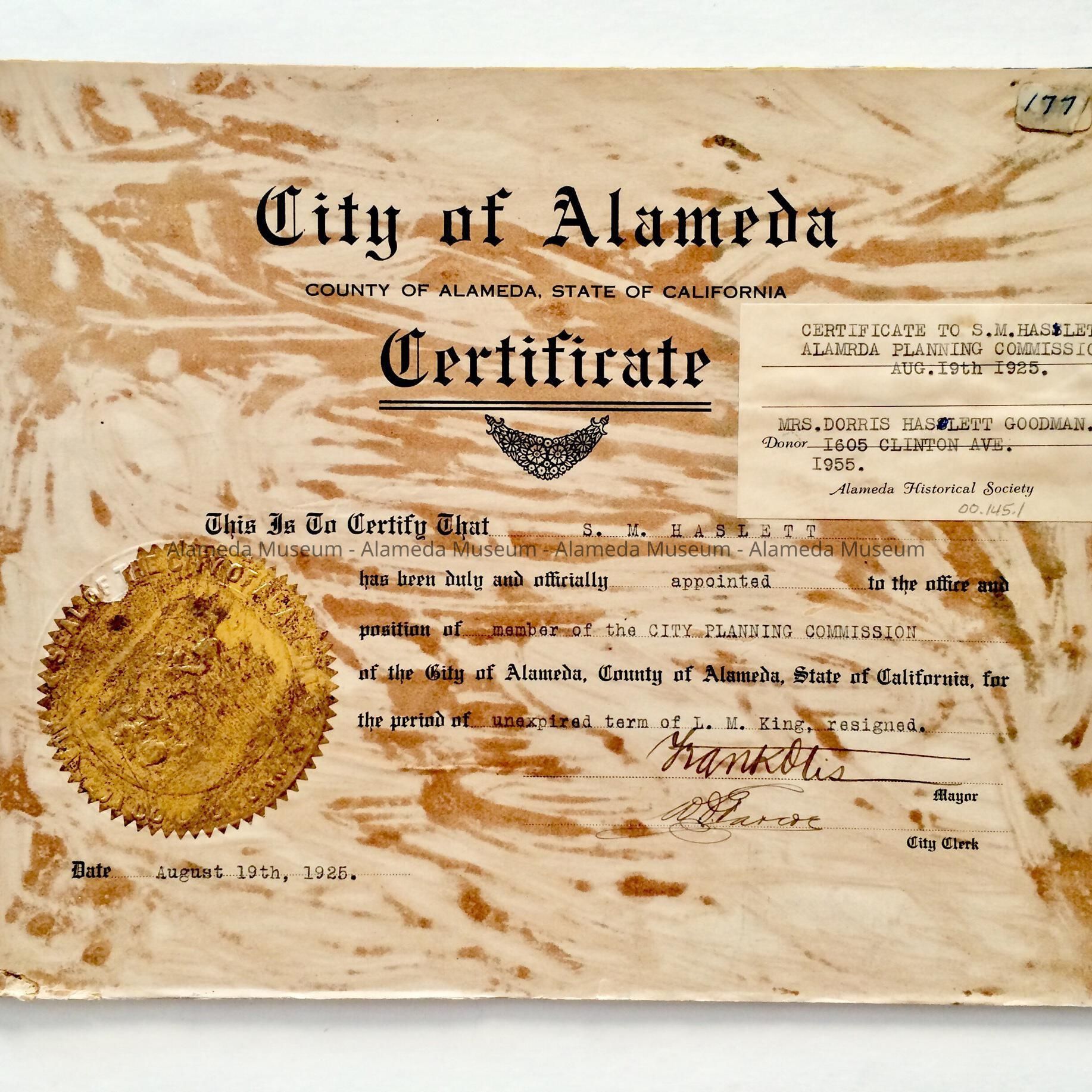 History: Certificate awarded S.M. Haslett was a member of the City Planning Commission, City of Alameda dated August 19, 1925.