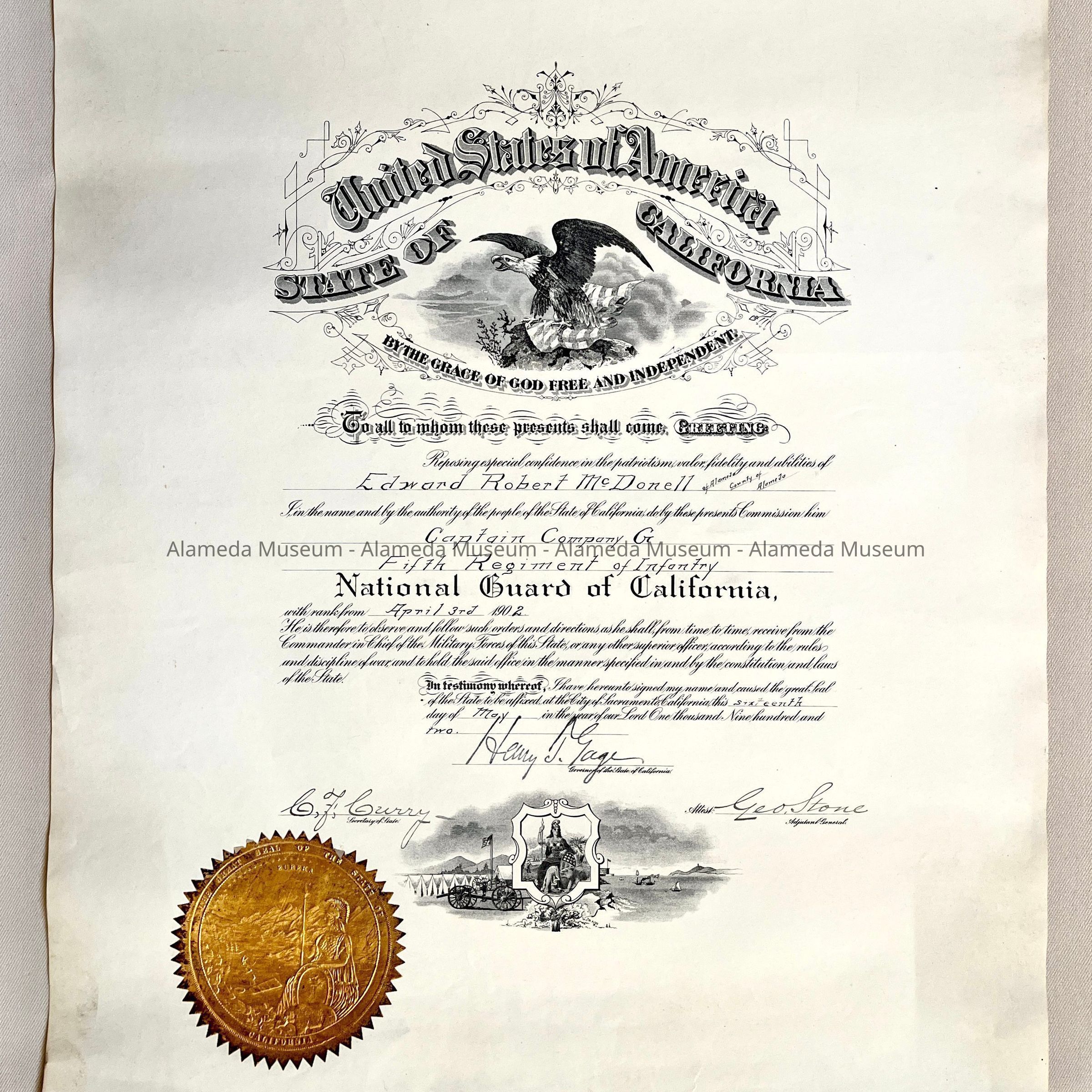History of Object: Certificate appointing Edward Robert McDonell, Captain of Company G, Fifth Regiment of Infantry, Alameda National Guard, April 3rd, 1902, signed by Henry T. Gage, Governor of the State of California.