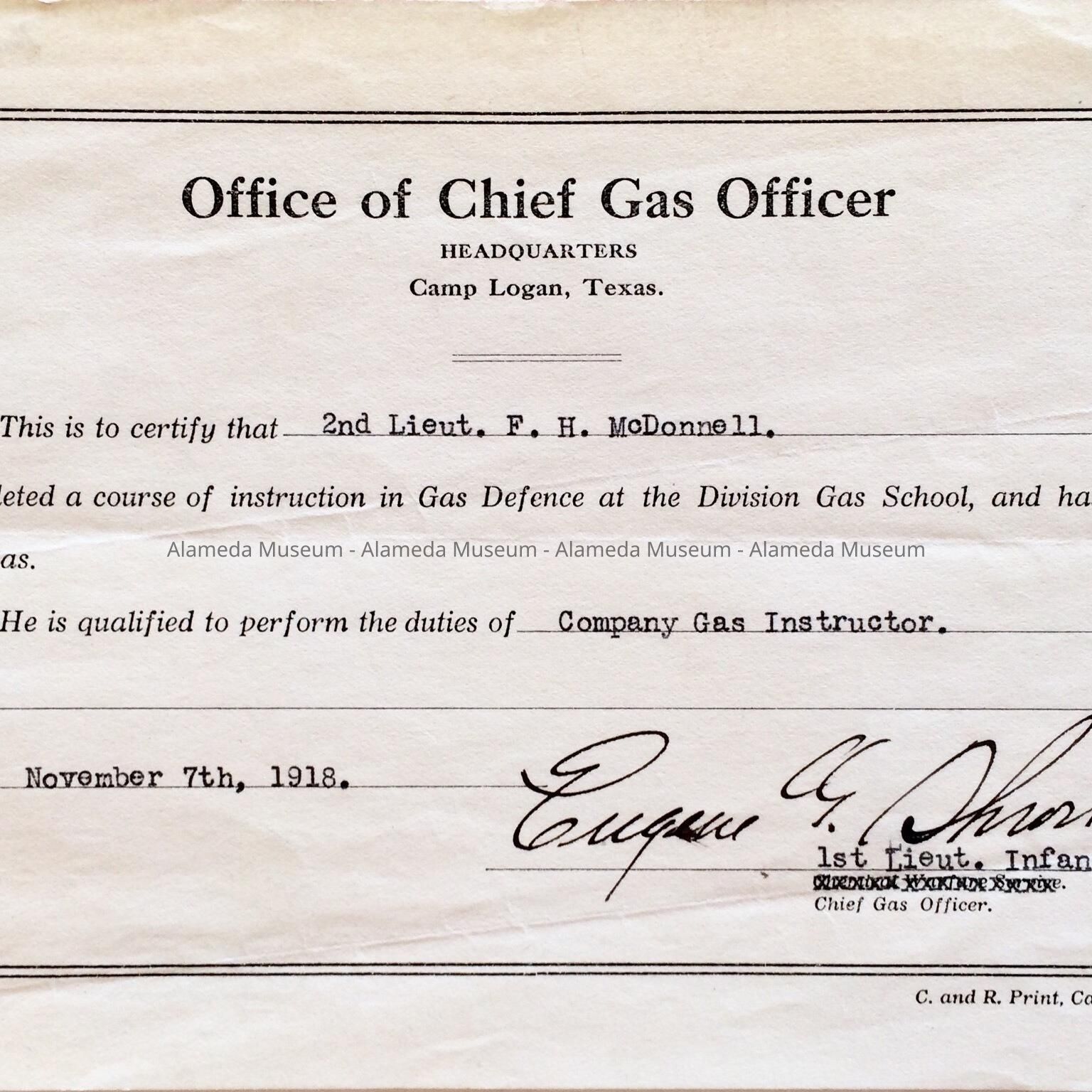 CERTIFICATE AWARDED TO SECOND LIEUTENANT FREDERICK HAMLIN MCDONELL, FOR HAVING COMPLETING A COURSE OF INSTRUCTION IN GAS DEFENSE, DATED NOVEMBER 17, 1918.