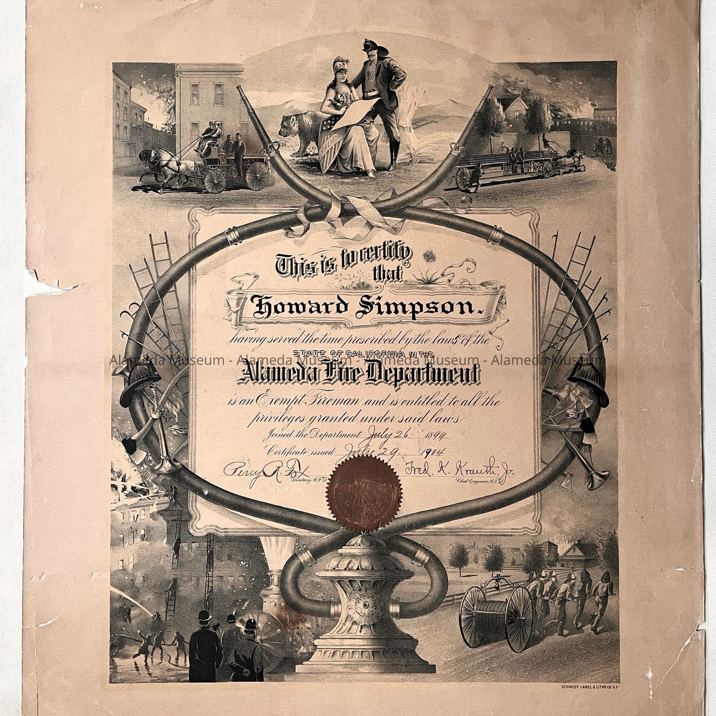History: Certificate awarded to Howard Simpson issued by the Alameda Fire Department for the period July 26, 1899 through July 29, 1904 and signed by Fred K. Krauth, Jr. Fire Chief. The Certificate also states that Mr. Simpson is an exempt Fireman which allows him to be free of jury duty. Given to the Alameda Historical Society prior to 1971 and numbered 63x.
