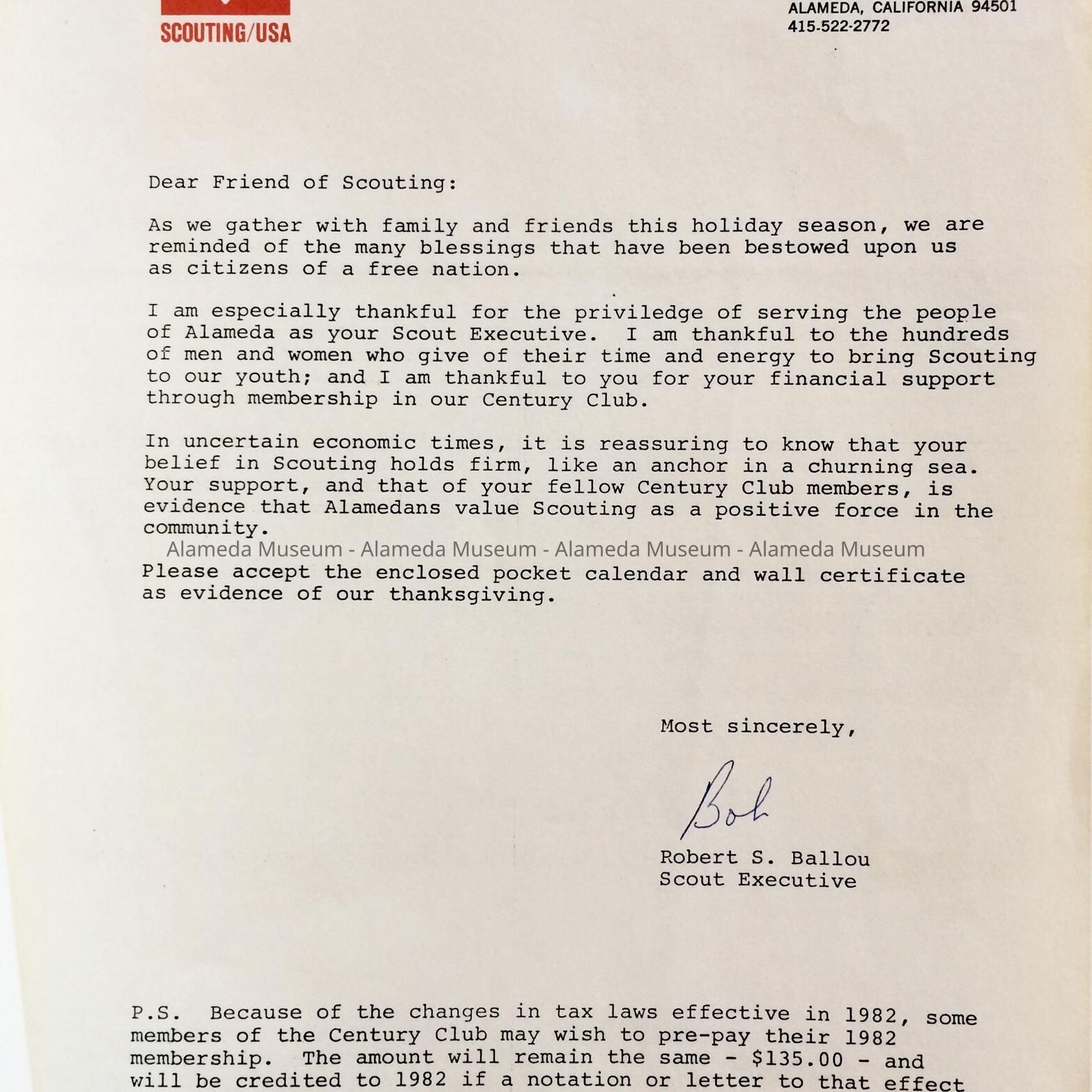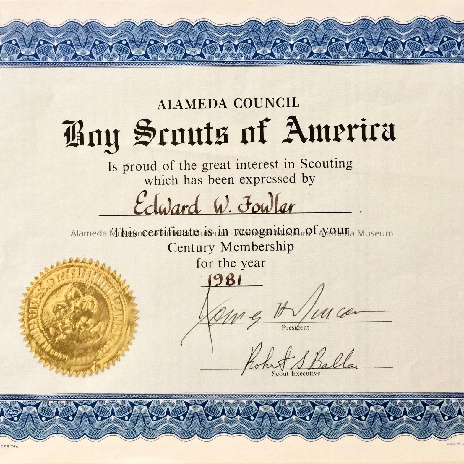 History: Certificate awarded the late Edward E. Fowler for his years of interest in the Alameda Council of the Boy Scouts of America. Mr. Fowler was a lifelong resident of the City.