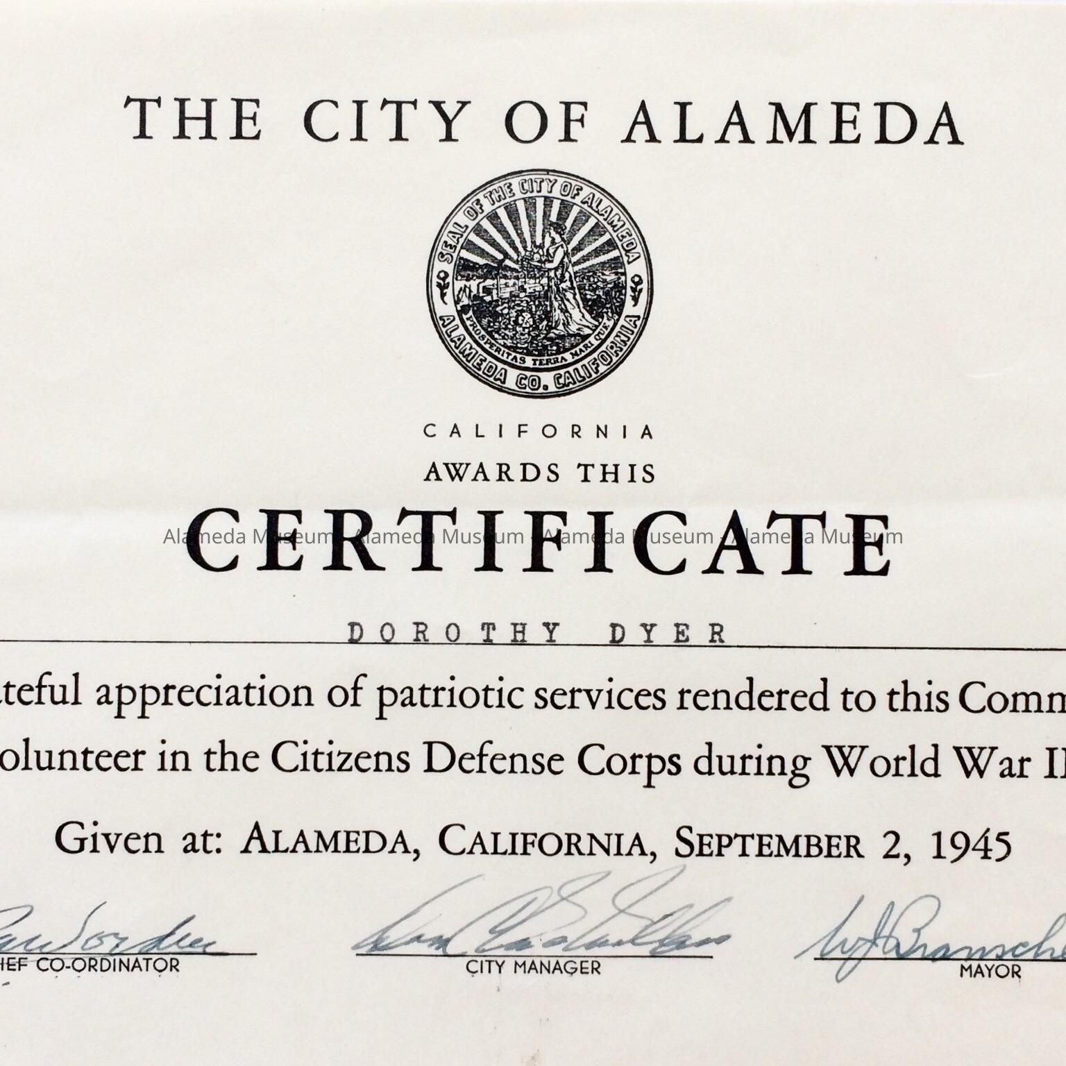 CERTIFICATE AWARDED TO DOROTHY DYER, VOLUNTEER IN THE CITIZENS' DEFENSE CORPS, DURING WORLD WAR II. CERTIFICATE ISSUED BY THE CITY OF ALAMEDA, CALIFORNIA, SEPTEMBER 2, 1945.