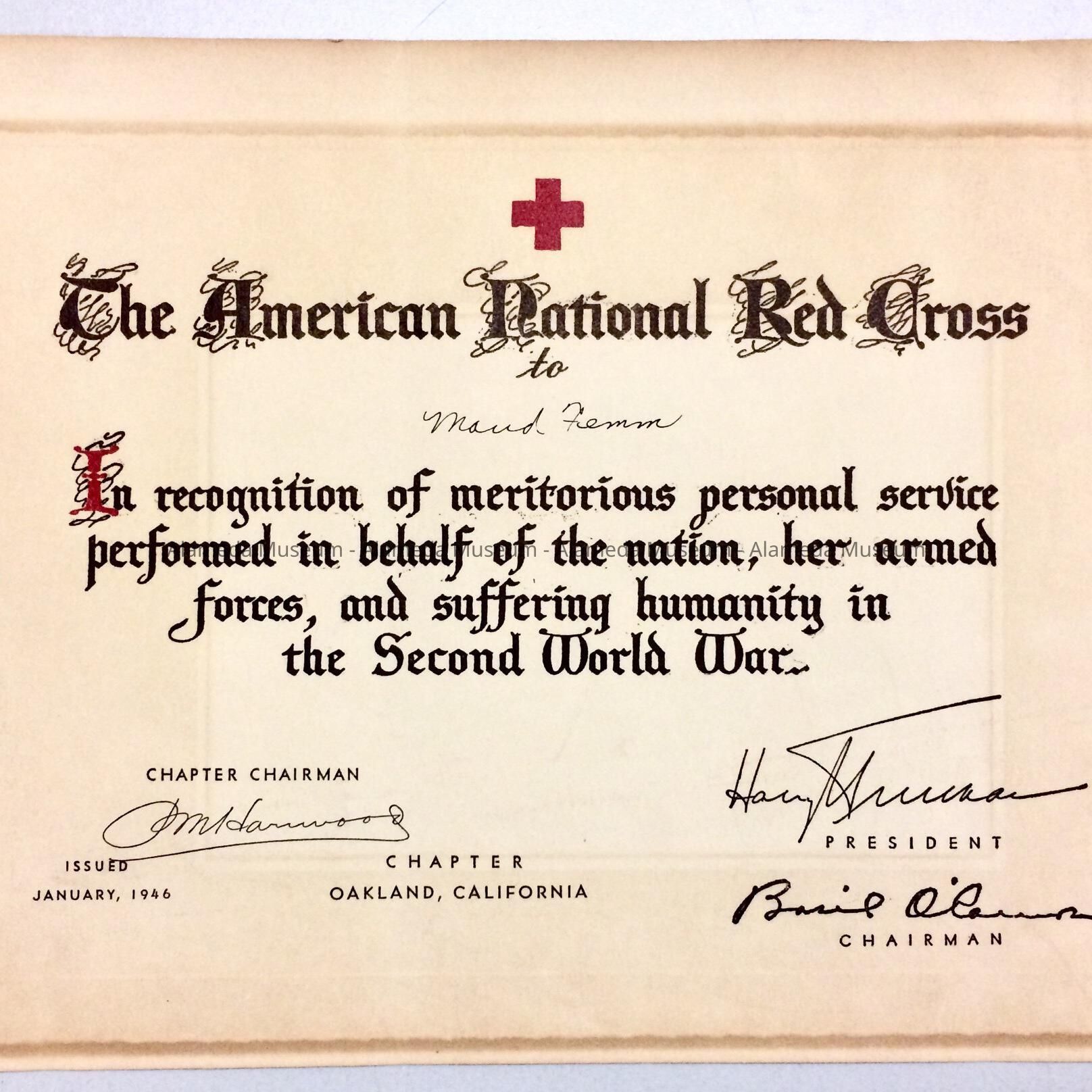 Certificate from Red Cross to Maude Fenn for services in WWII, 1946Entry/Object ID