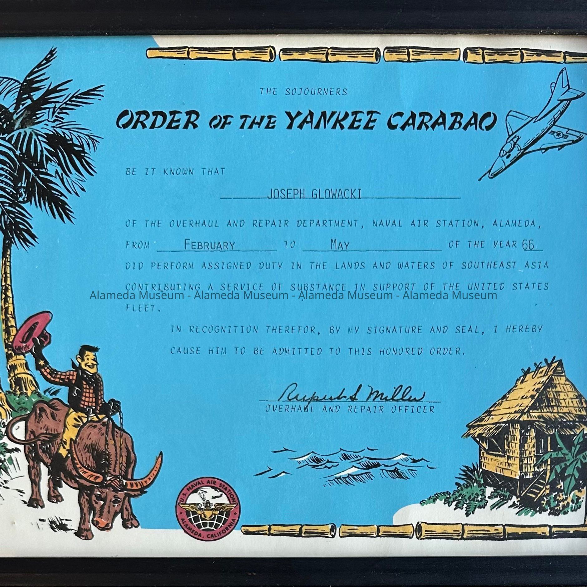 A CERTIFICATE AWARDED TO JOSEPH GLOWACKI (FEBRUARY TO MAY, 1966), FOR PERFORMANCE AT THE OVERHAUL AND REPAIR DEPARTMENT, ALAMEDA NAVAL AIR STATION.