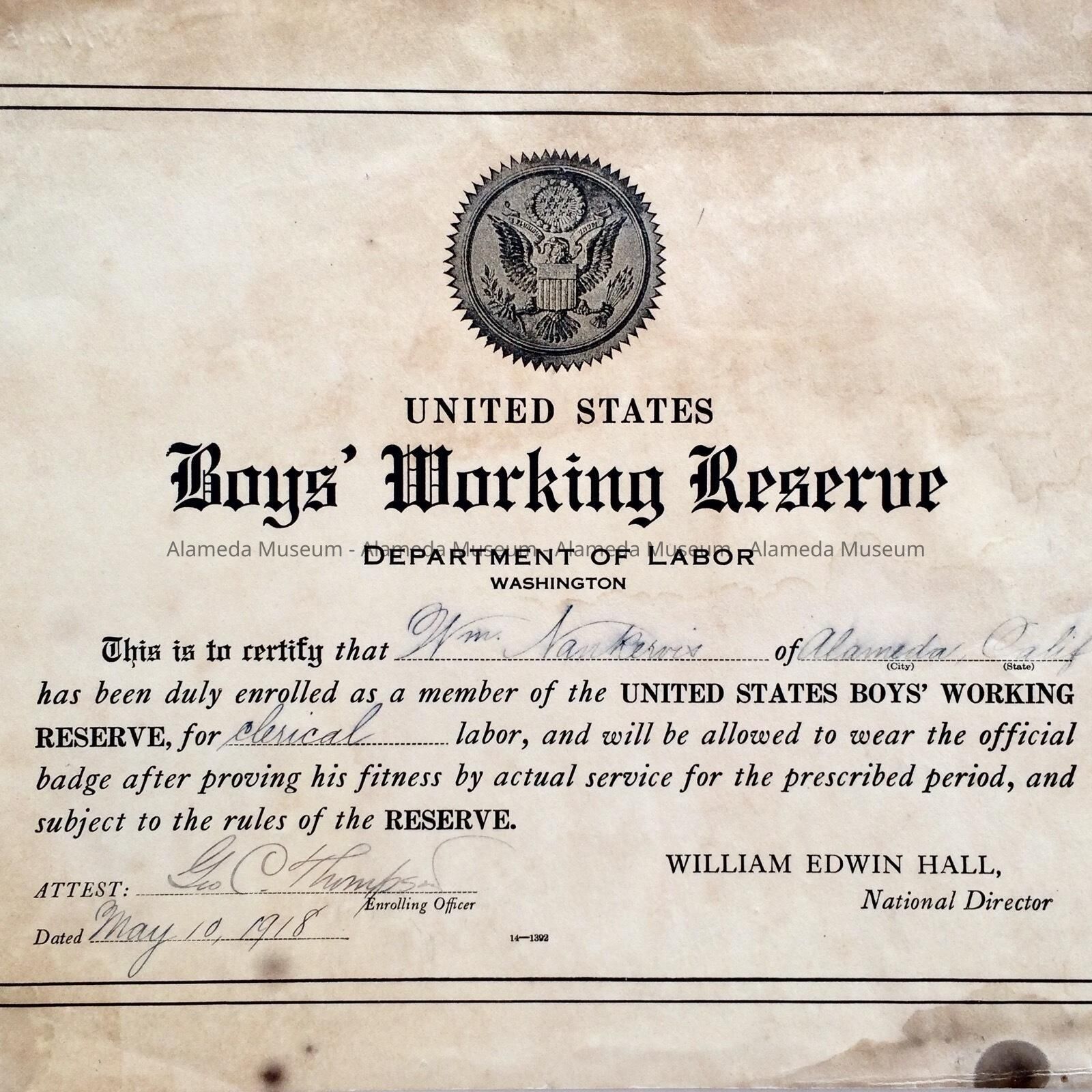 HISTORY OF OBJECT: CERTIFICATE THAT Wm. NANKERVIS OF ALAMEDA HAS BEEN DULY ENROLLED AS A MEMBER OF THE UNITED STATES BOYS’ WORKING RESERVE, DURING WORLD WAR 1. SIGNED BY GEO. C. THOMPSON, PRINCIPAL OF ALAMEDA HIGH SCHOOL, MAY 10, 1918