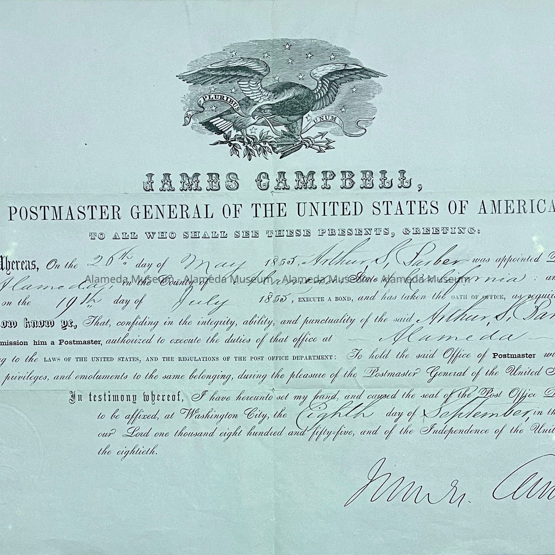 Rare certificate of appointment awarded to Arthur S. Barber, first Postmaster of Alameda, dated September 8, 1855. The certificate is signed by James Campbell, Postmaster General of the United States.