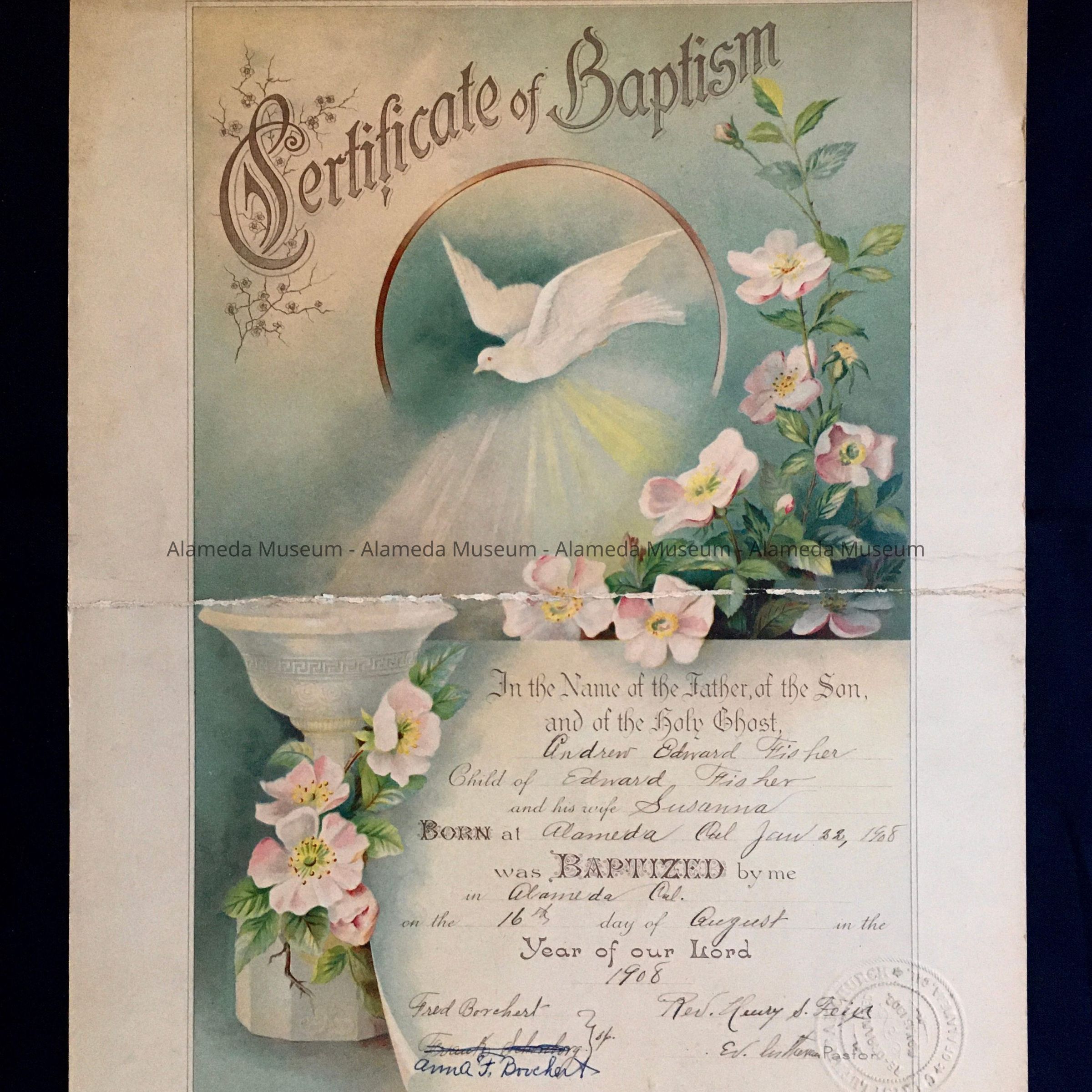 History of Object: Certificate of Baptism for Andrew Edward, child of Edward & Susanna (Schomborg) Fisher, born Alameda, Cal., Jan. 22, 1908. He was baptized at the German Lutheran Church, Lafayette Street, Aug. 16, 1908.