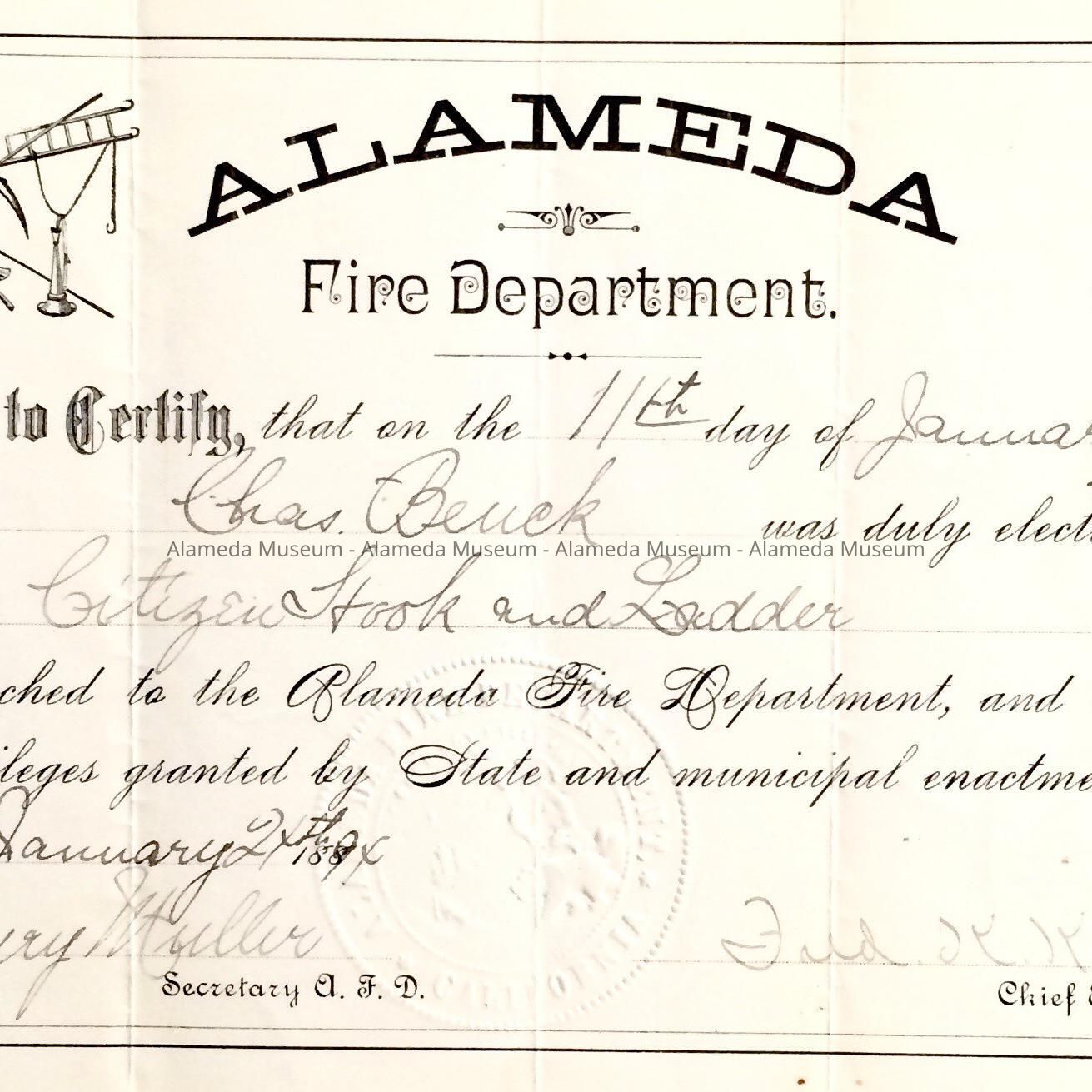 CERTIFICATE STATING THAT, "ON JANUARY 11, 1894, CHARLES BEUCK WAS DULY ELECTED AN ACTIVE MEMBER OF THE CITIZENS HOOK-AND-LADDER COMPANY NO. 1, ATTACHED TO THE ALAMEDA FIRE DEPARTMENT.". CERTIFICATE WAS ISSUED ON JANUARY 24, 1894 AND SIGNED BY FRED K KRAUTH, JR, FIRE CHIEF.
