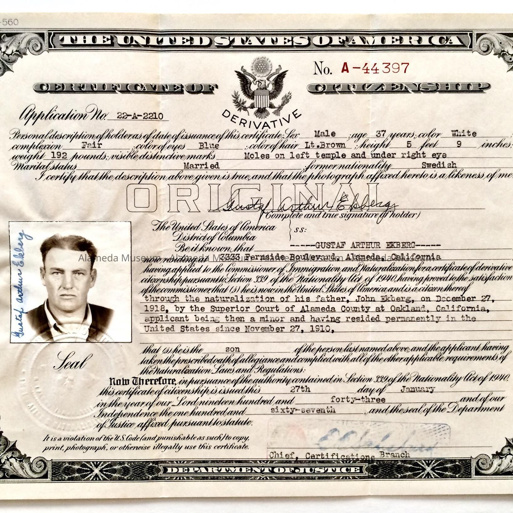 History of Object: A CERTIFICATE OF CITIZENSHIP FOR GUSTAF ARTHUR EKBERG, BORN IN SWEDEN. HE EVENTUALLY BECAME A CITIZEN OF ALAMEDA AND RESIDED AT 3333 FERNSIDE BOULEVARD.