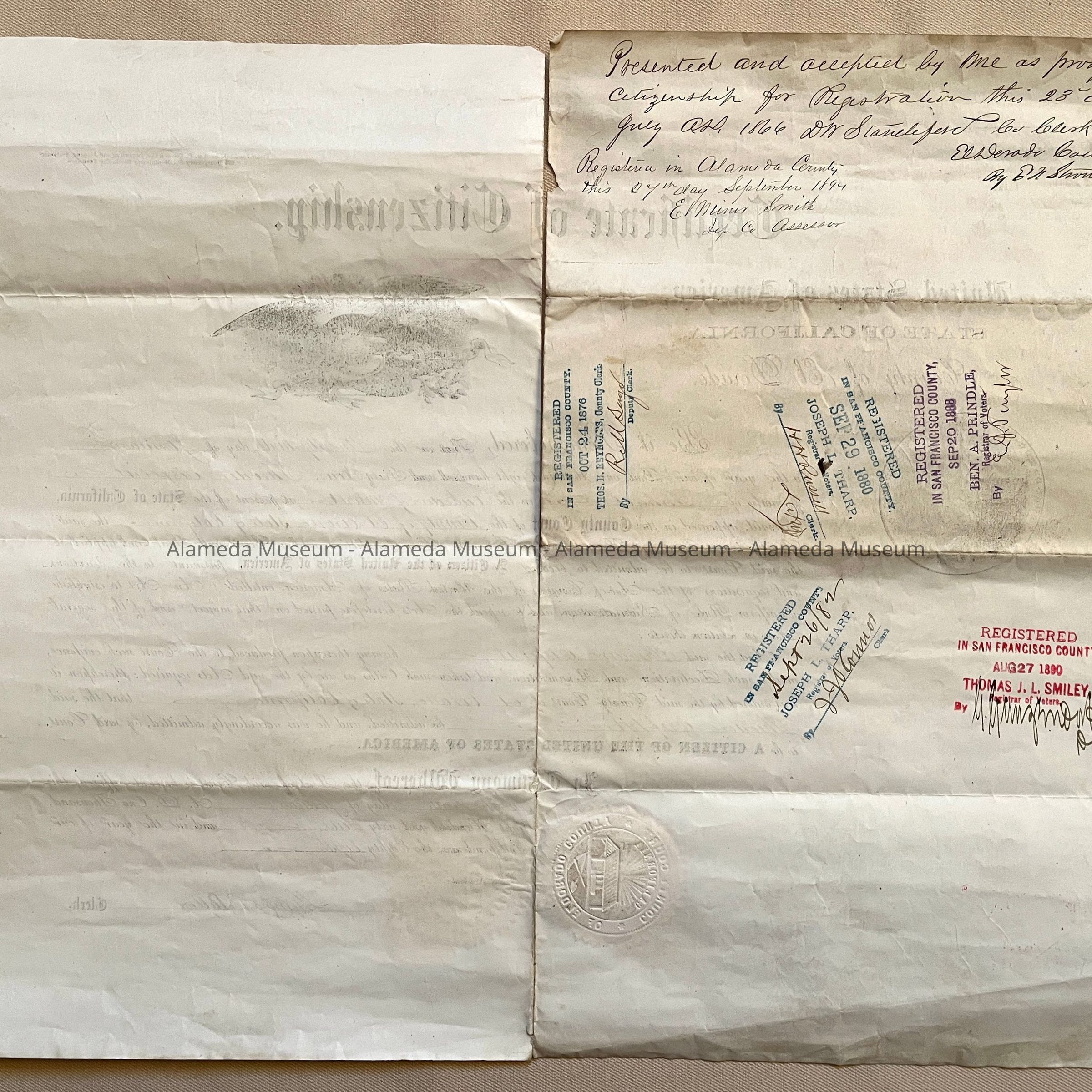 History of Object: Certificate of Citizenship, issued in the County of El Dorado, of Theodore Eisfeldt, dated Jan. 29, 1864. Mr. Eisfeldt, a professional musician, had a house built in 1892 at 1722 Buena Vista Avenue. He and his family were longtime residents of Alameda.