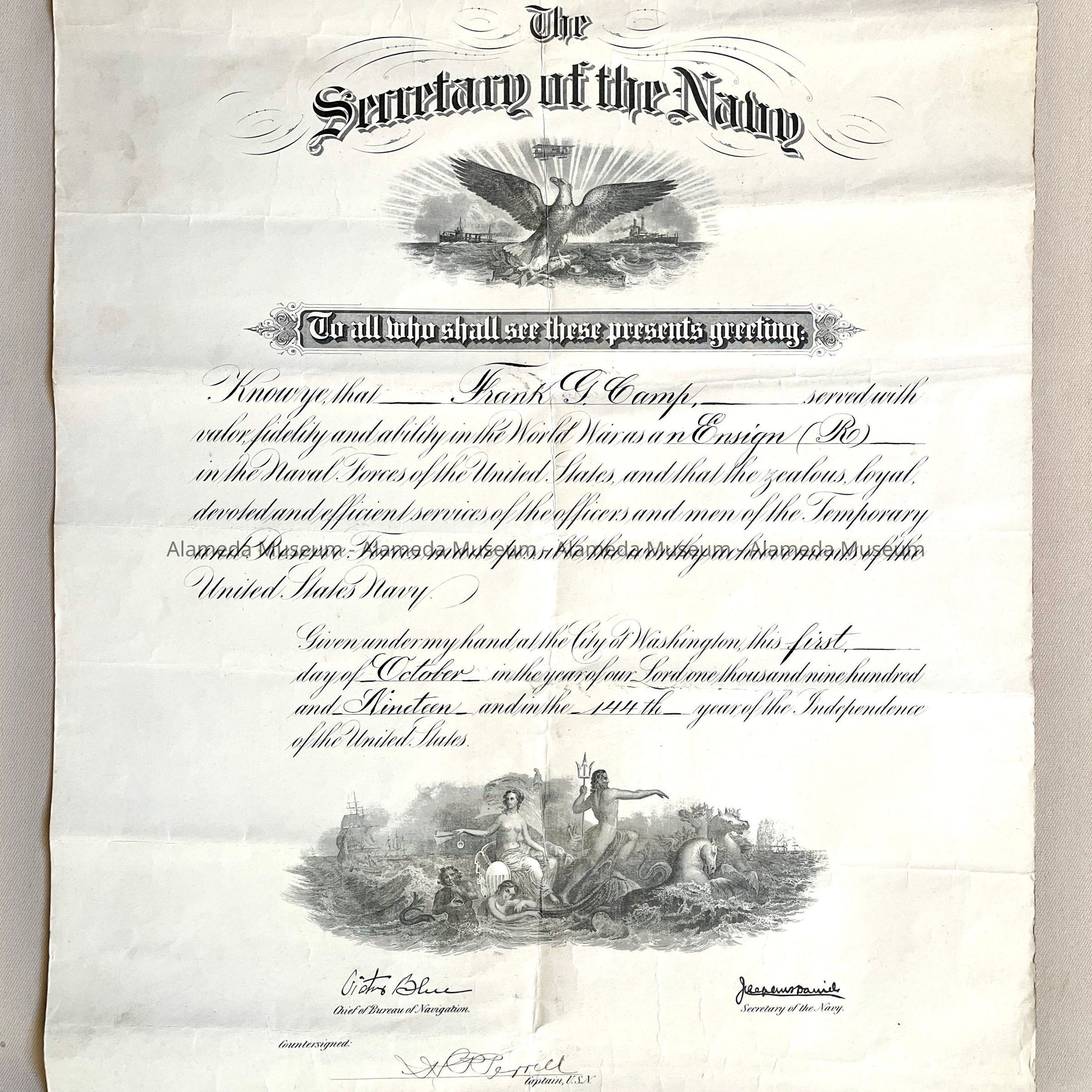 Certificate of commendation to Frank Camp for serving as Ensign, 1919Entry/Object ID