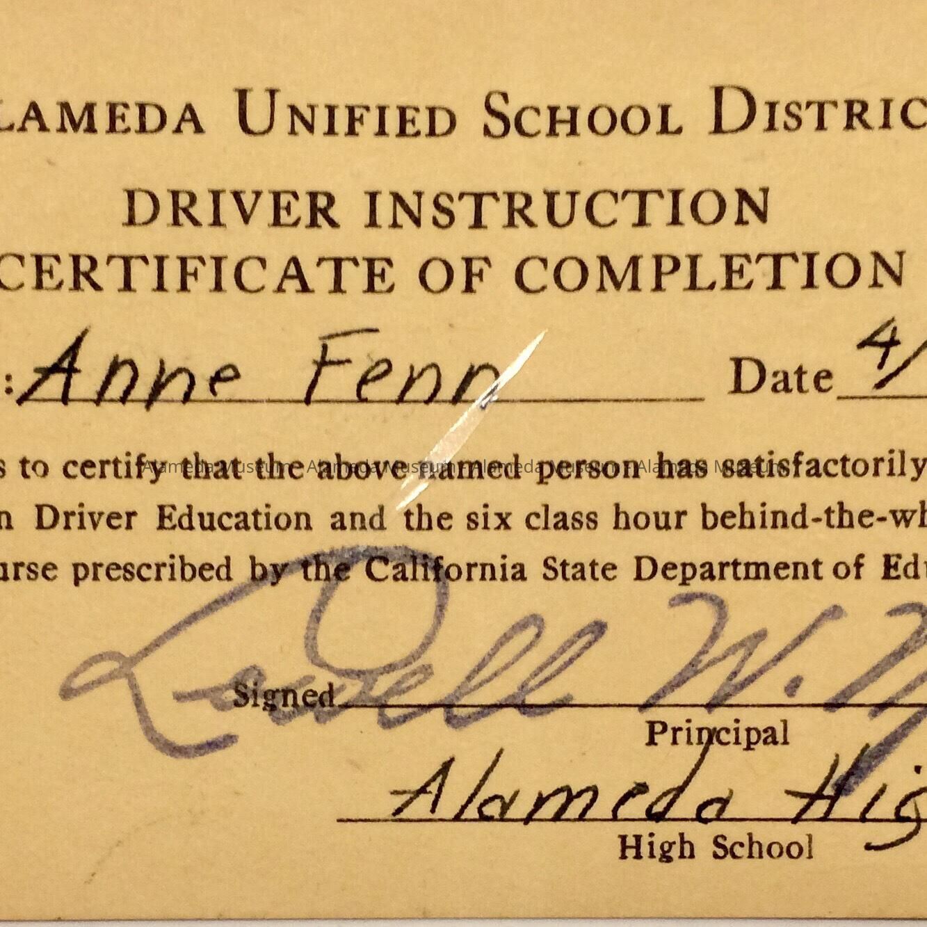 HISTORY OF OBJECT: A CERTIFICATE OF COMPLETION OF DRIVER'S INSTRUCTION AWARDED IN 1964 TO ANNE FENN, ISSUED BY THE ALAMEDA UNIFIED SCHOOL DISTRICT.