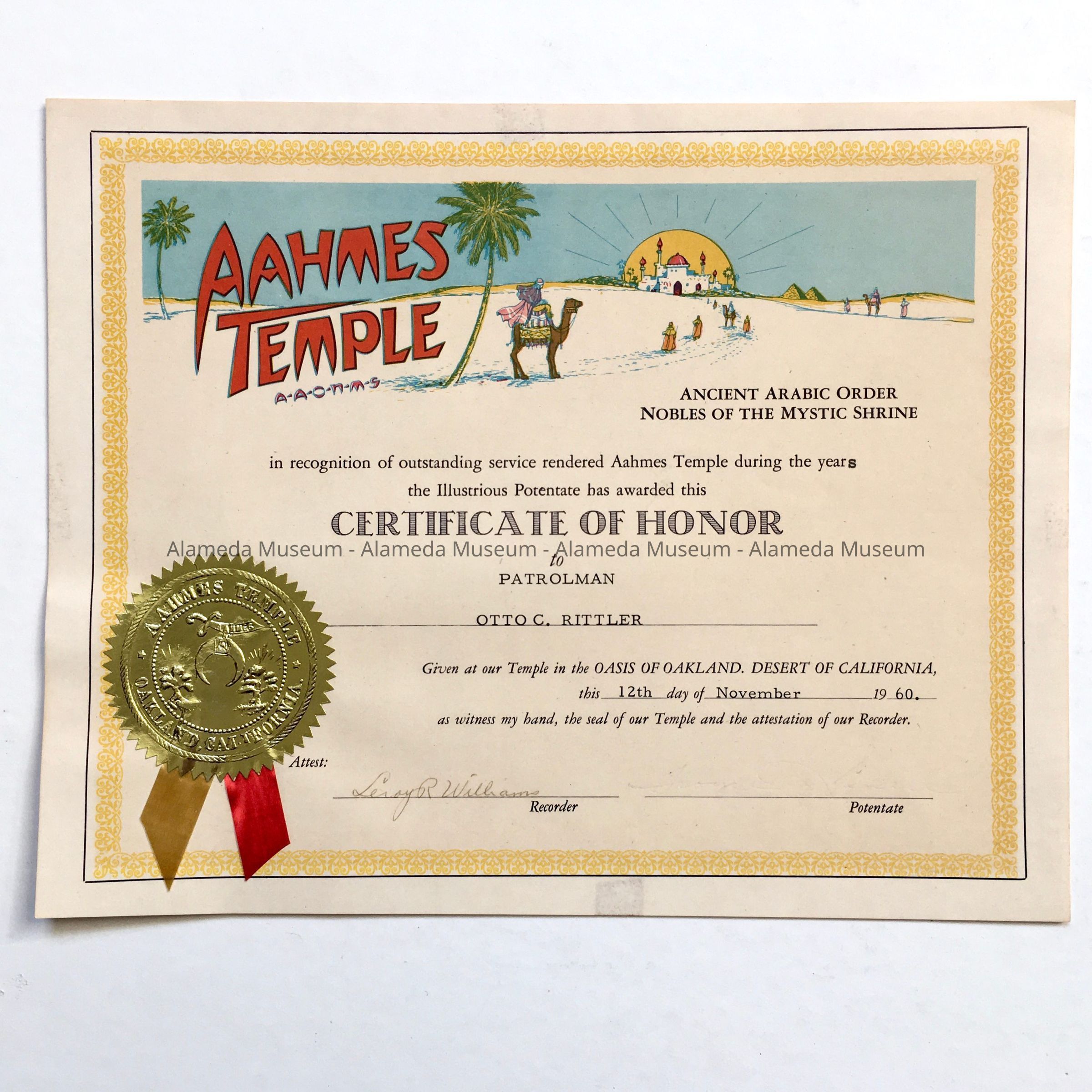 Description: Certificate has colorful graphics at top of desert scene, man in desert garb on saddled camel, mosque in front, on horizon setting sun, several figures walking towards mosque, two palm trees, and in red letters AAHMES Temple. Certificate acknowledges service rendered to the Oakland temple and was presented to Rittler on November 12, 1966.