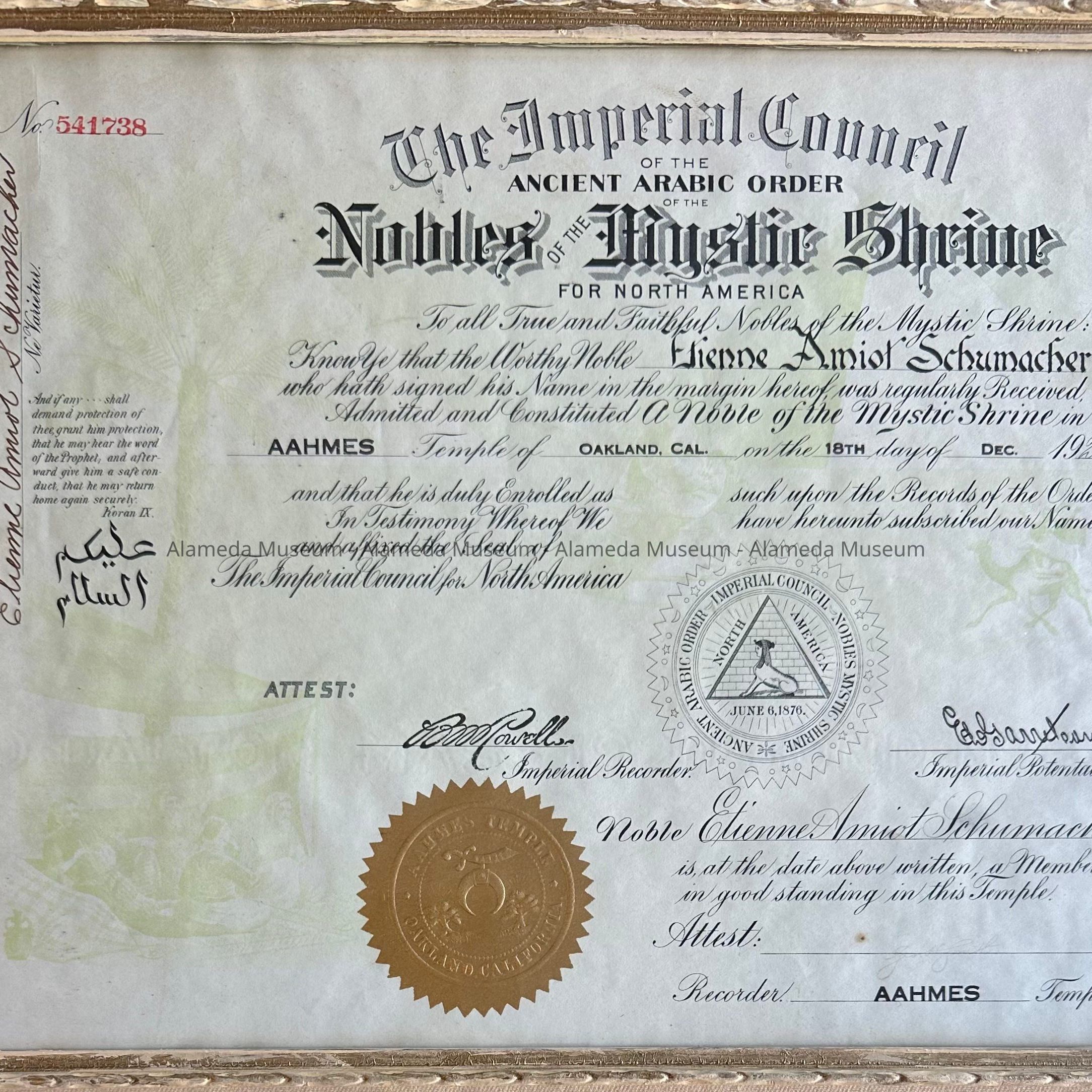 CERTIFICATE OF MEMBERSHIP BESTOWED ON ETIENNE AMIOT SCHUMACHER, FROM THE AAHMES TEMPLE, OAKLAND, CAL., DECEMBER 18, 1920. MR. SCHUMACHER IS BELIEVED TO BE THE HUSBAND OF MABEL BRINK SCHUMACHER.