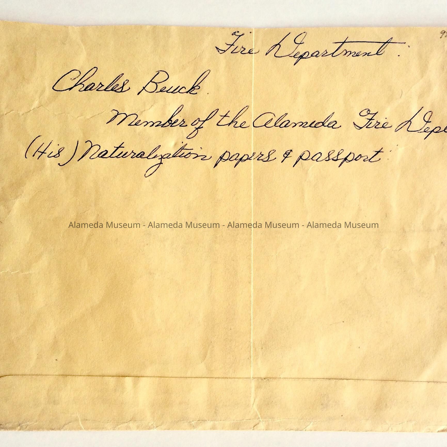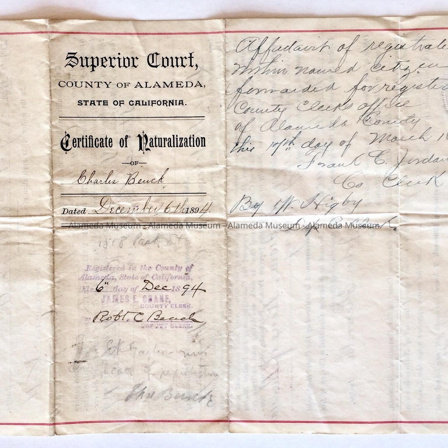 CERTIFICATE OF NATURALIZATION, DATED DECEMBER 6, 1894, ISSUED TO CHARLES BEUCK. PRESIDING JUDGE, JOHN ELLSWORTH, WAS AN ALAMEDA RESIDENT. MR BEUCK WAS A MEMBER OF THE ALAMEDA FIRE DEPARTMENT. DOCUMENT WAS GIVEN TO THE ALAMEDA HISTORICAL SOCIETY PRIOR TO 1971 AND HERETOFORE NOT OFFICIALLY CATALOGED.