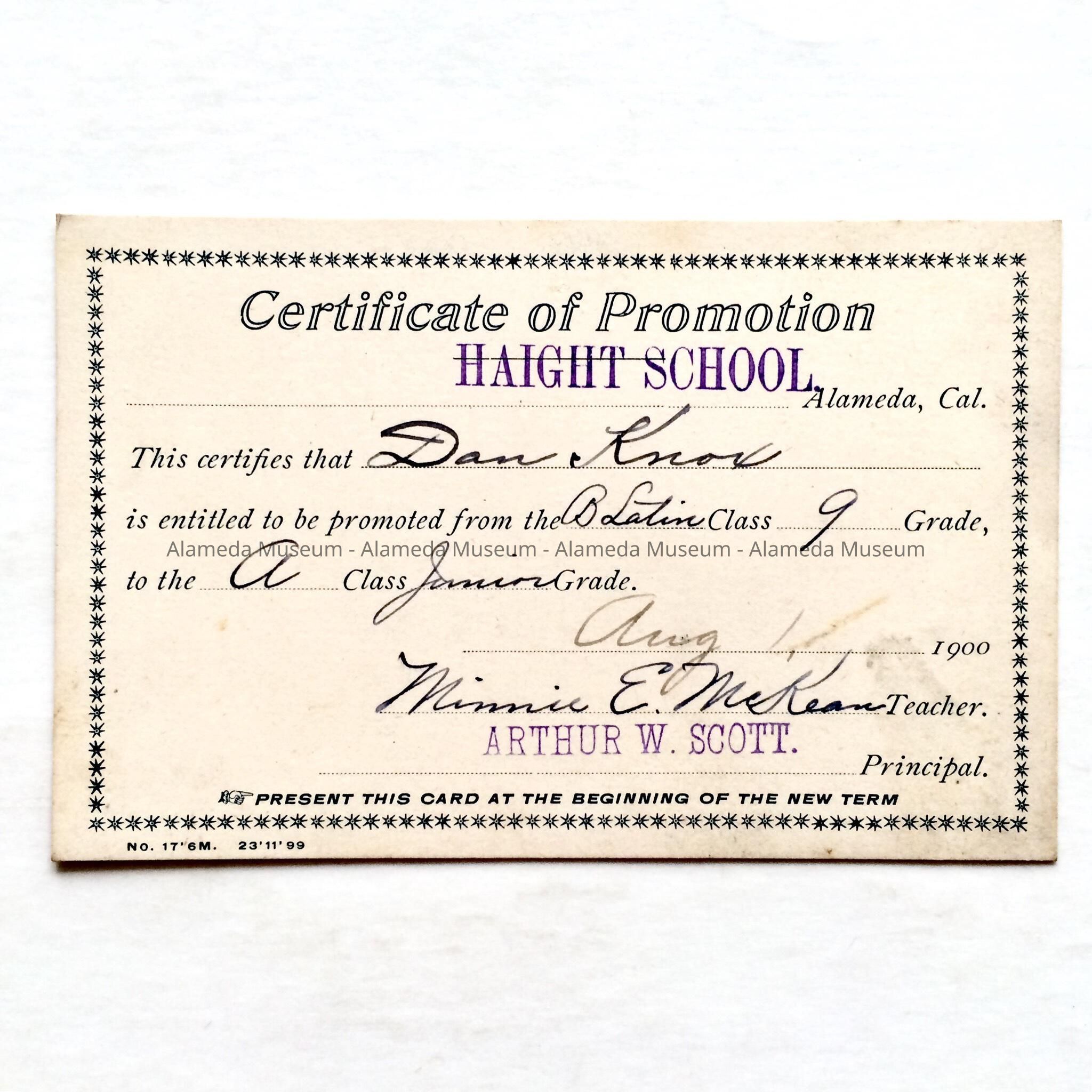 Certificate of Promotion for Latin Class, Haight School, to Daniel KnoxEntry/Object ID