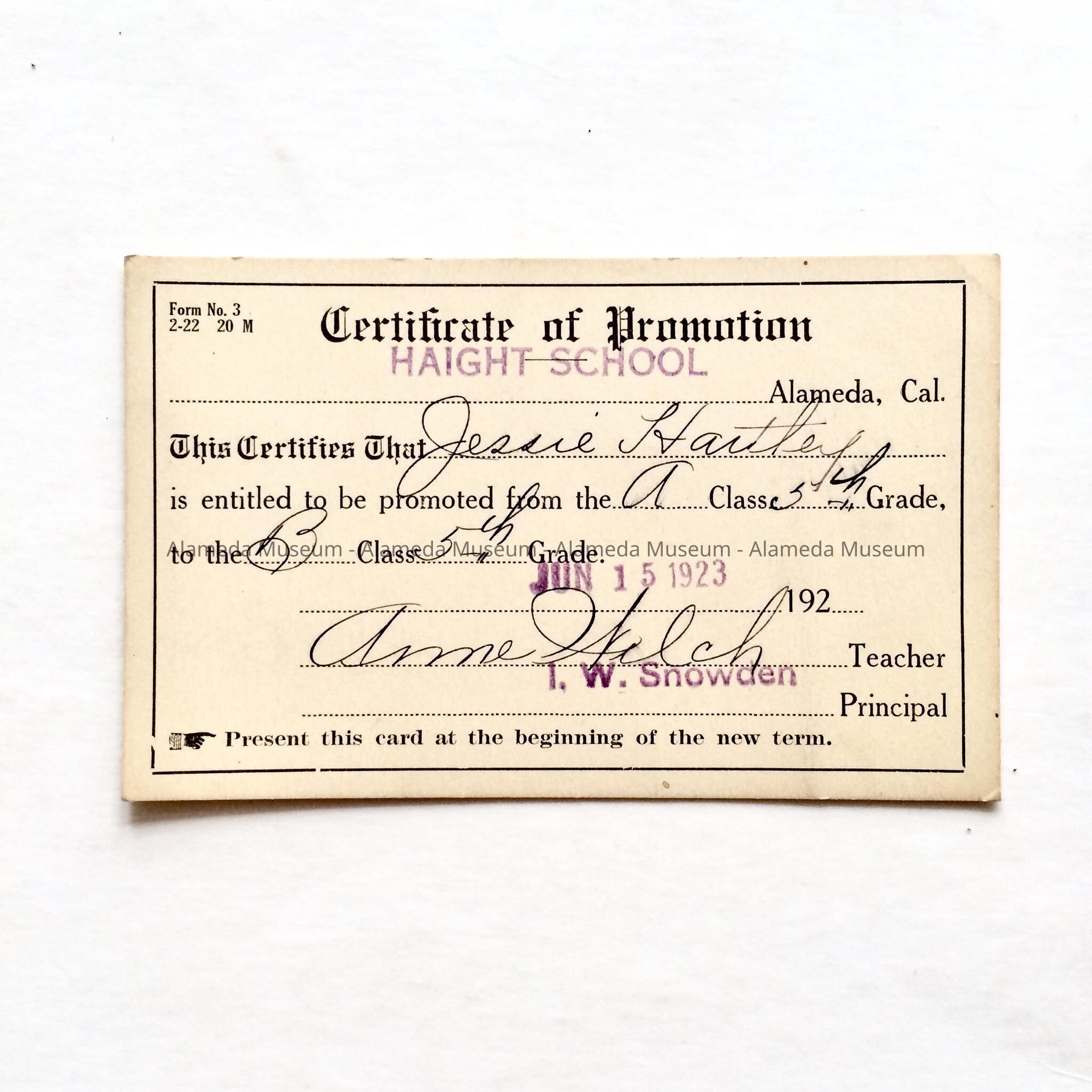 History of Object: Certificate of promotion from lower fifth to upper fifth grade issued to Jessie Hartley, Haight School, June 15, 1923.