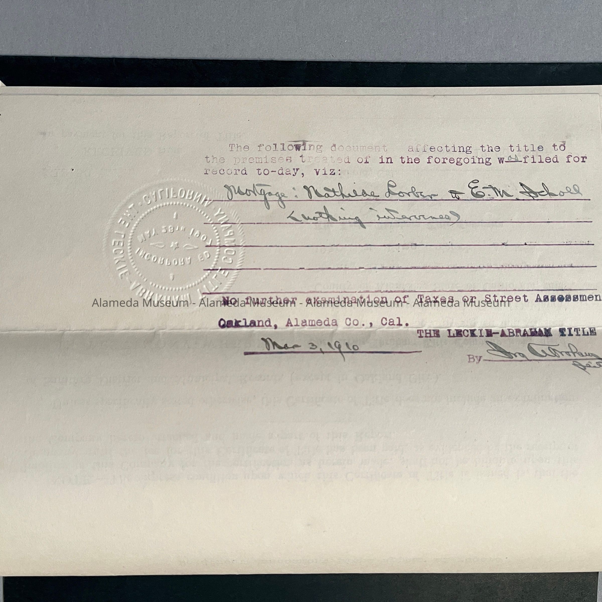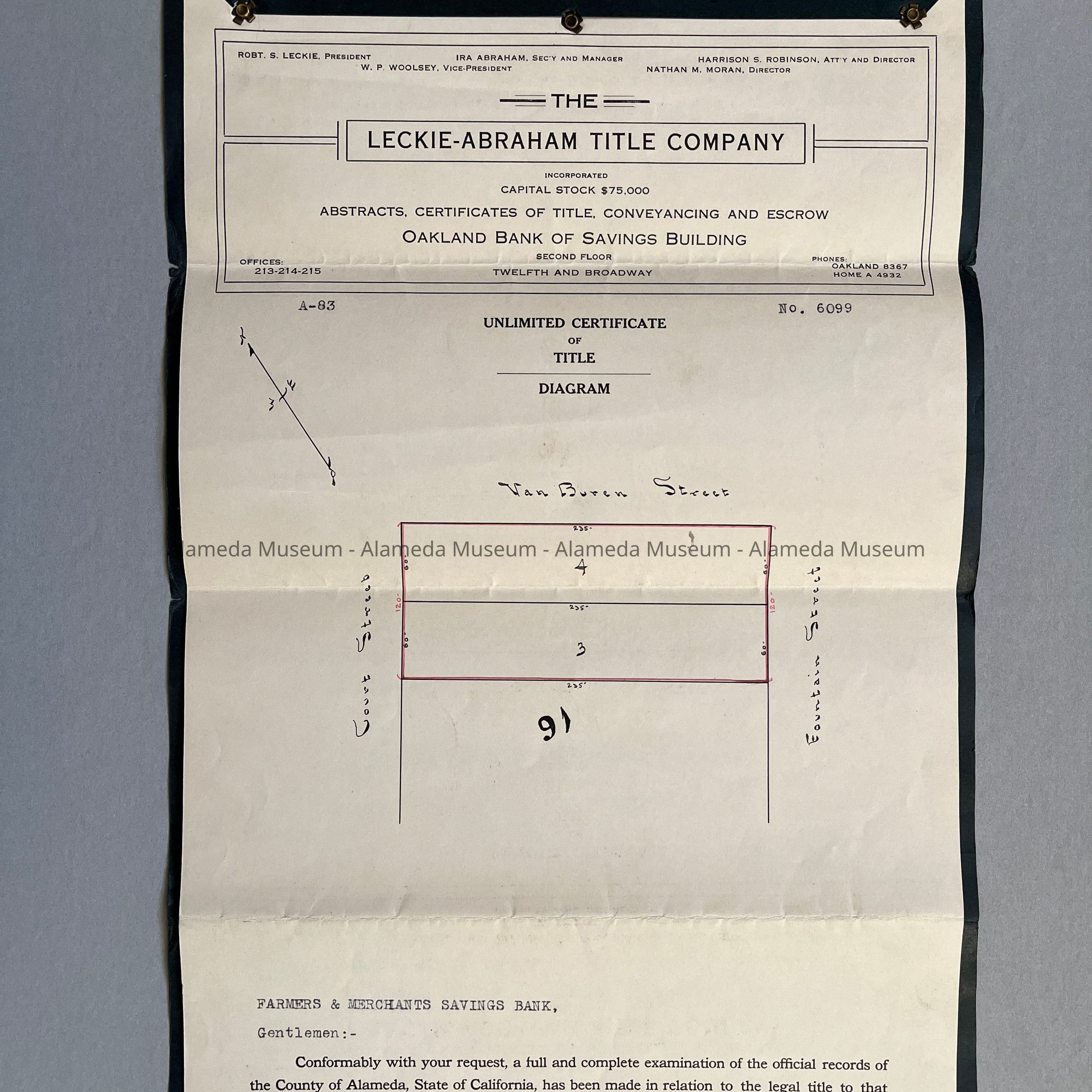 Certificate of Title for lots on Van Buren, Court, and Fountain Streets, 1910Entry/Object ID