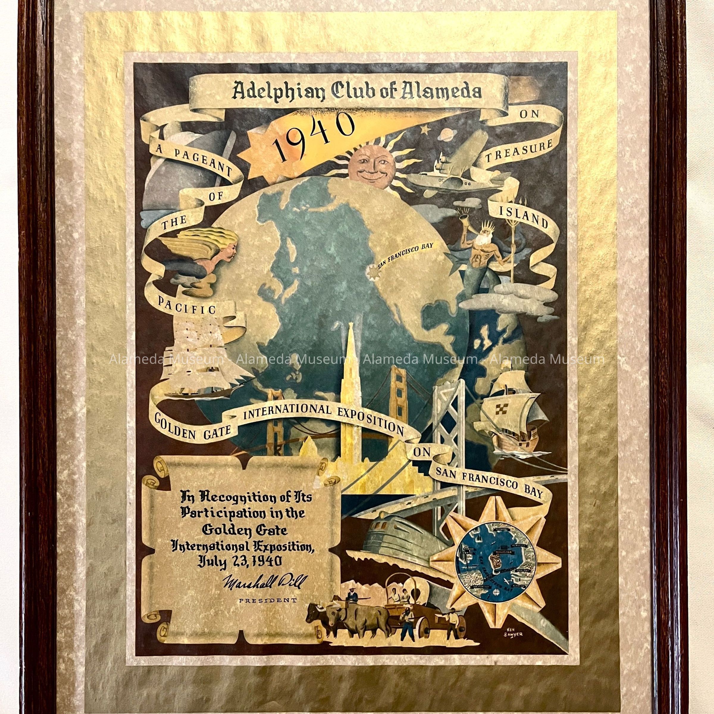 CERTIFICATE OF RECOGNITION FOR THE ADELPHIAN CLUB OF ALAMEDA, PARTICIPATION IN THE GOLDEN GATE INTERNATIONAL EXPOSITION AT TREASURE ISLAND, SAN FRANCISCO, CA. CERTIFICATE DATED JULY 23, 1940.