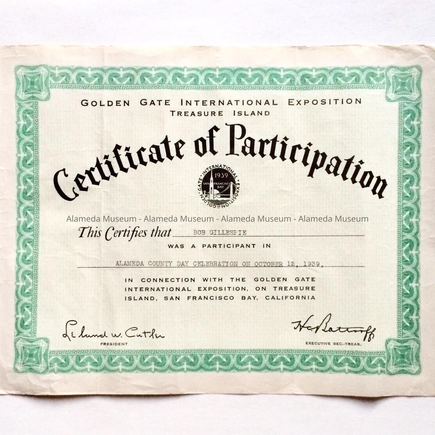 Certificate participation in Alameda County Day, Golden Gate International Exposition, 1939Entry/Object ID
